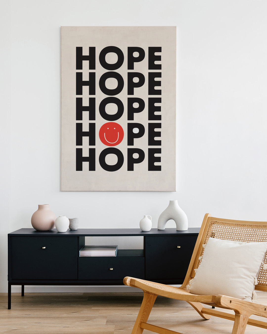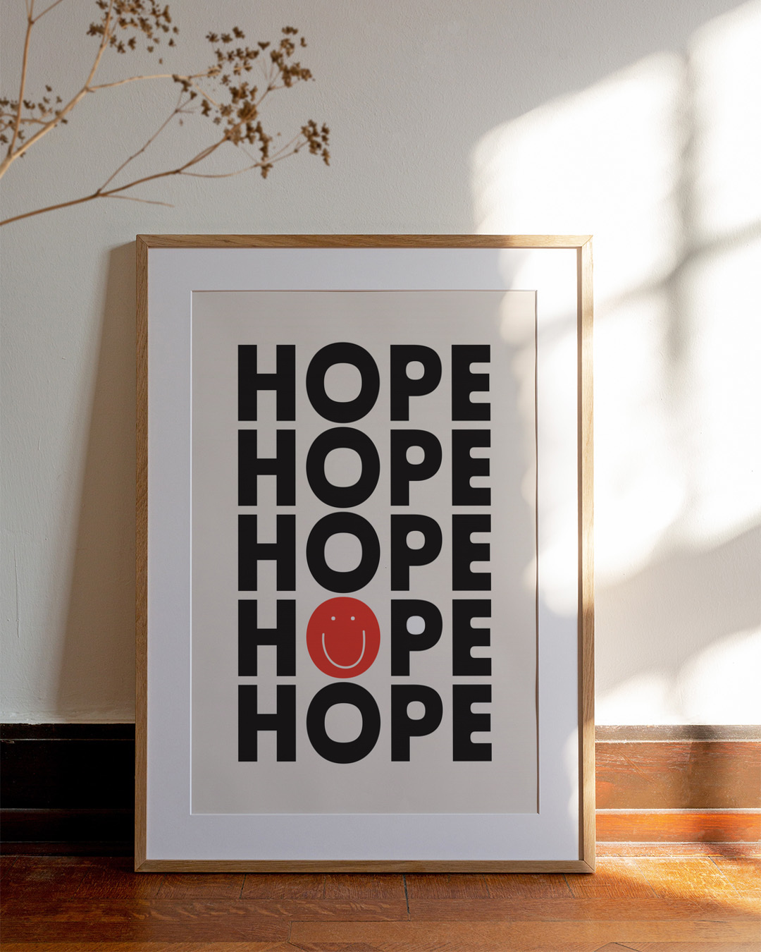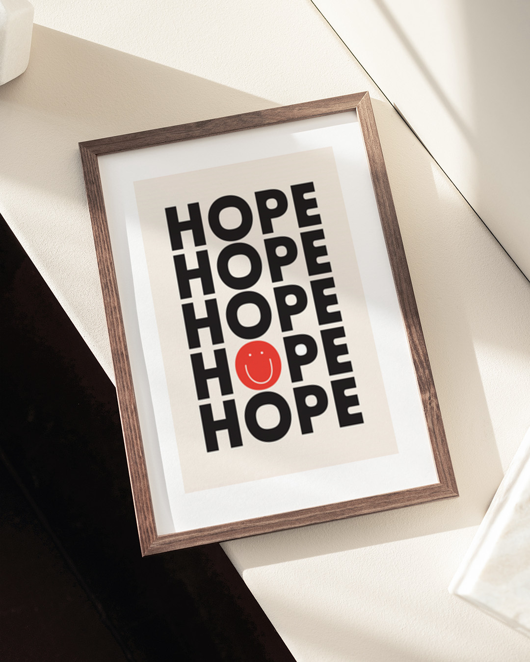 A playful and inspiring poster featuring repeated 'hope' text with a standout smiley face, bringing positivity and joy into any space.