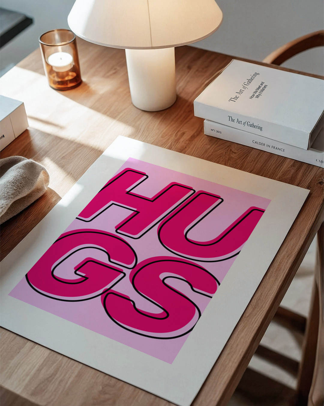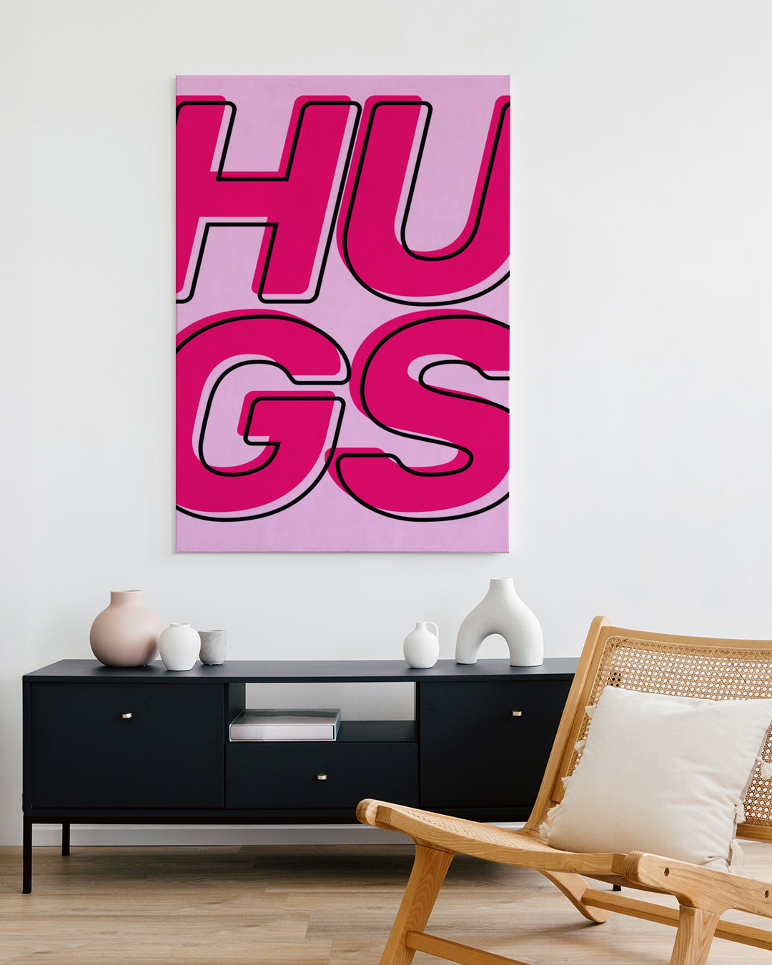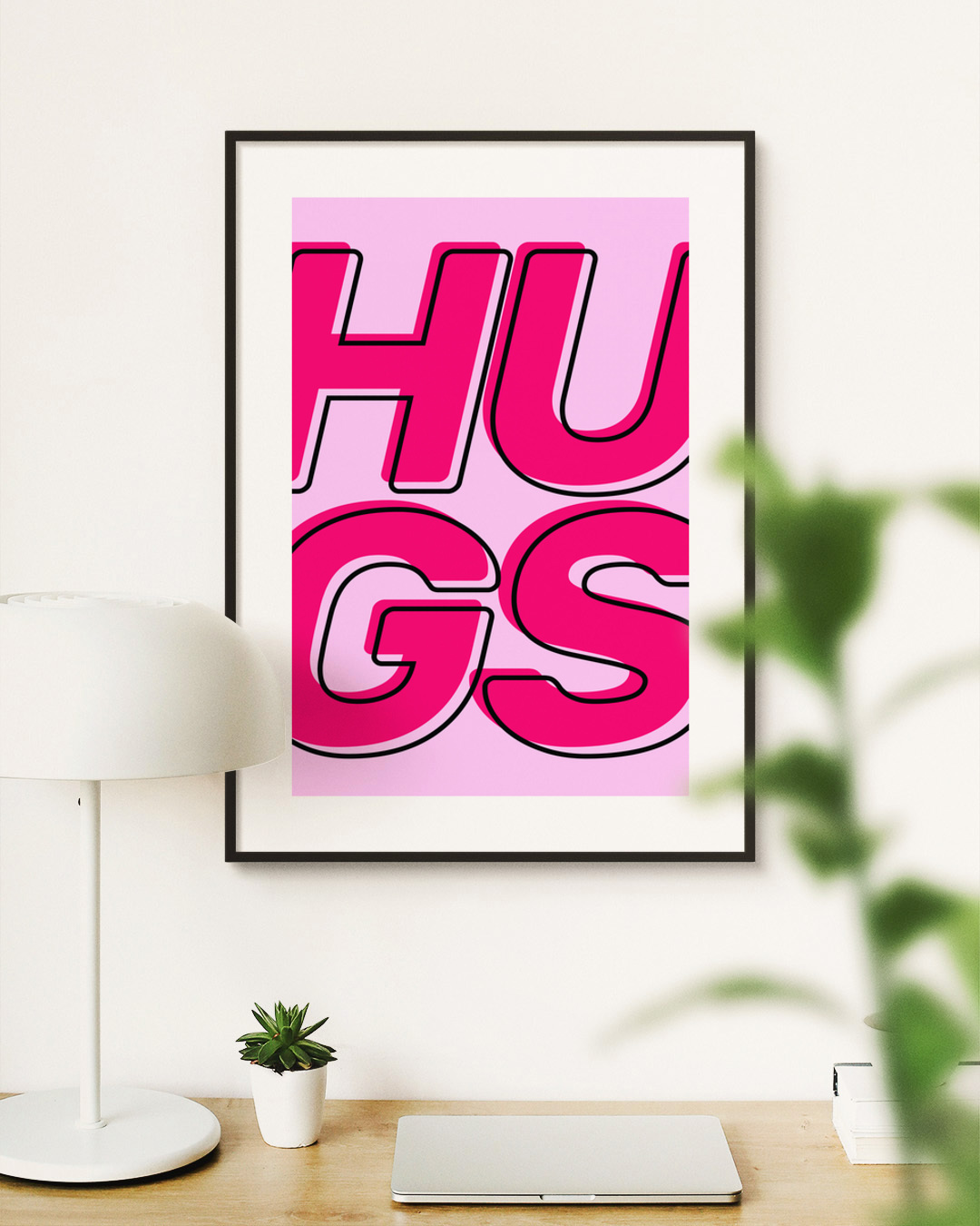 Bring warmth and humour to your space with this playful design featuring the word 'Hugs' in bold pink text. A perfect blend of pop art and cheerful vibes, ideal for adding a touch of joy.