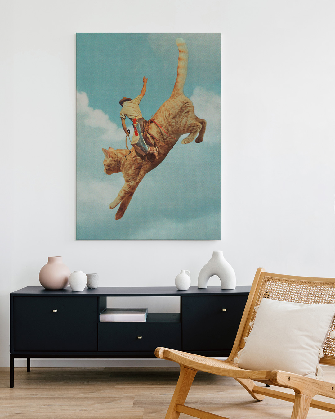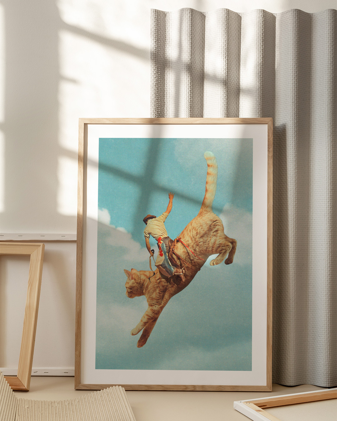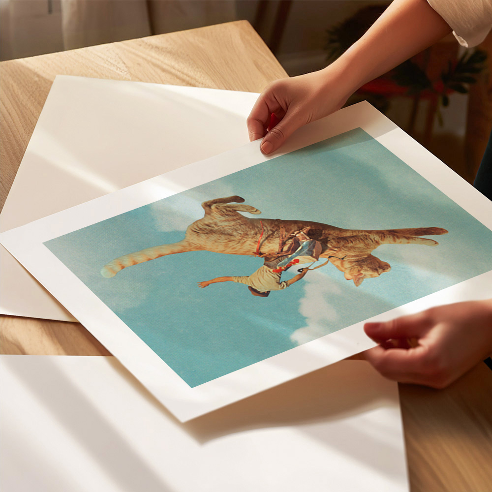 A humorous illustration of a man riding a giant orange cat soaring in the blue sky. The playful scene combines imaginative elements with a whimsical touch.