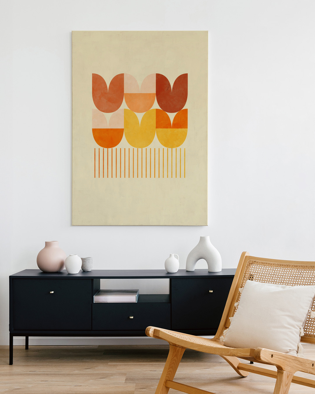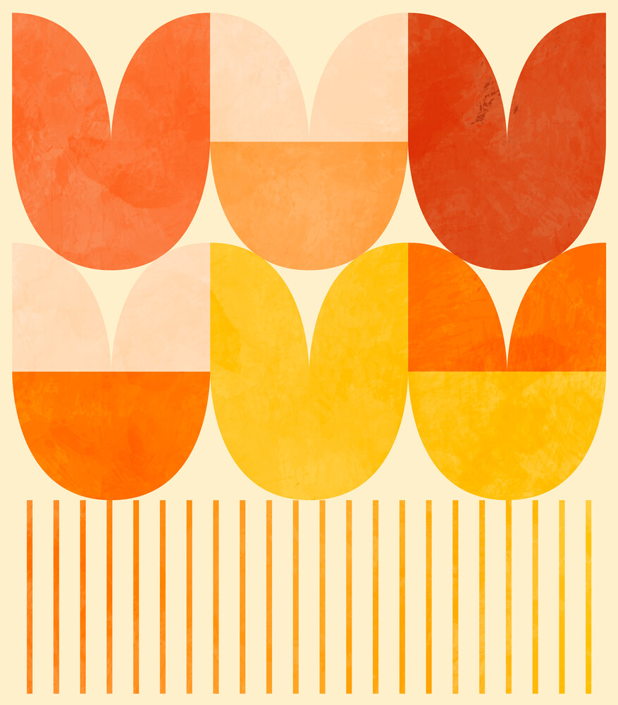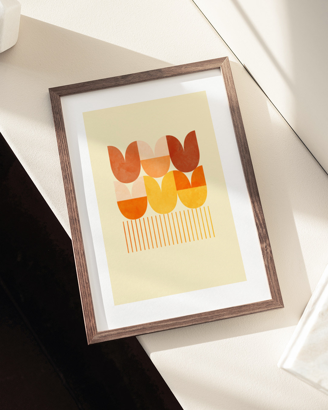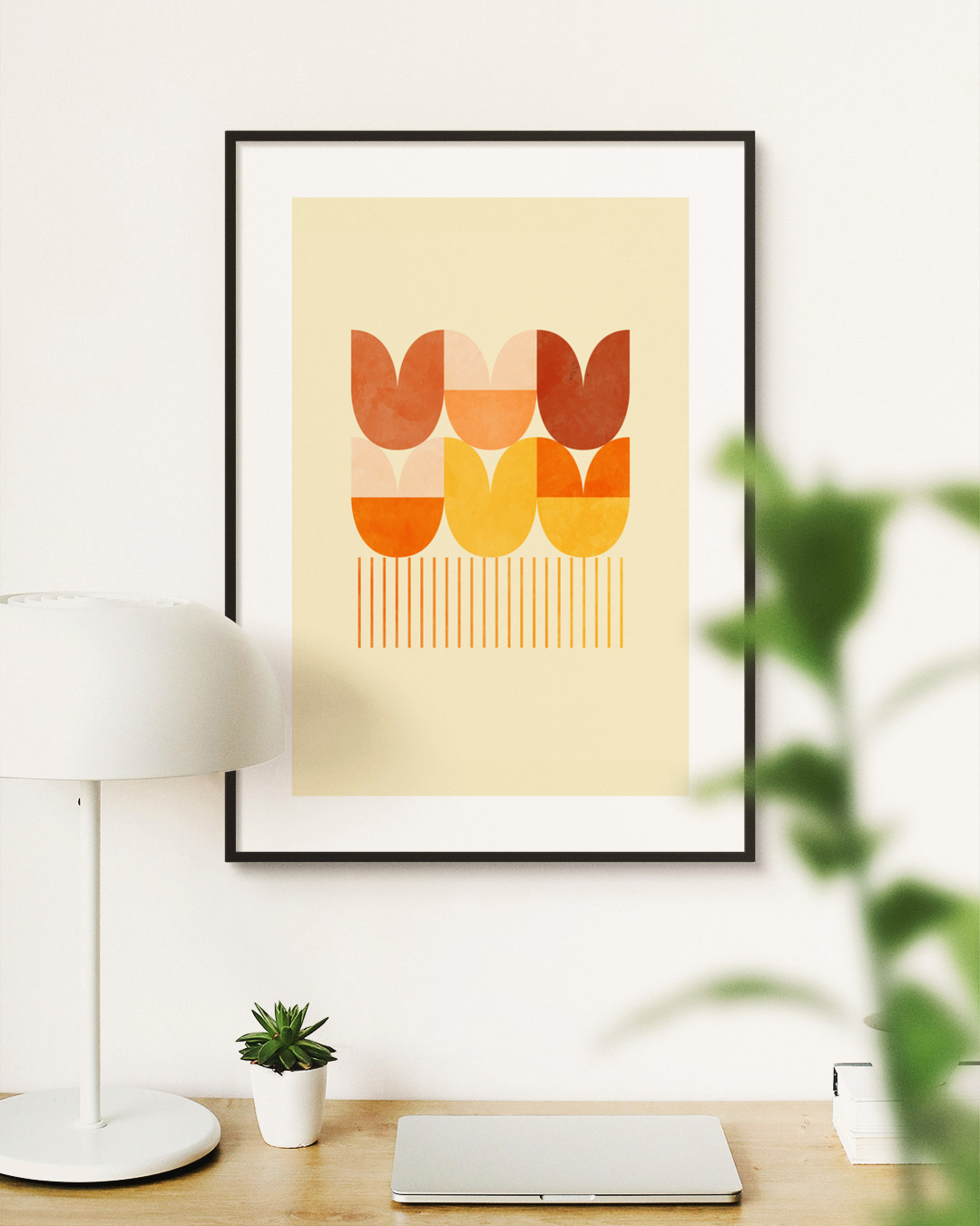 A modern geometric design featuring stylized tulip shapes in warm shades of orange and yellow. Created by Ana Rut Bre, this art print brings a vibrant botanical theme with its symmetrical and structured composition.