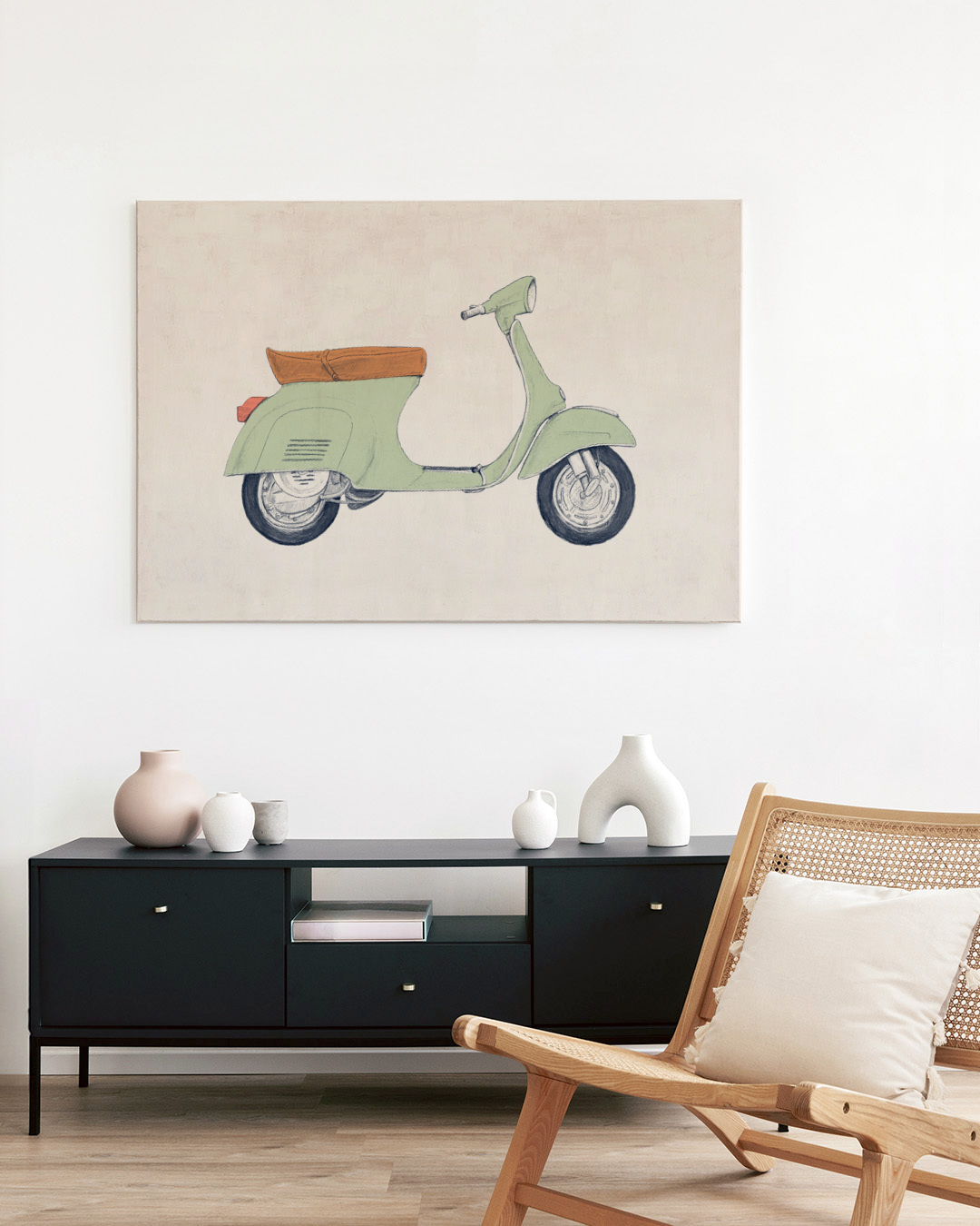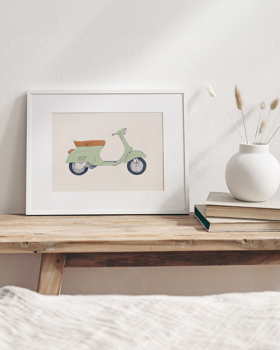 Experience vintage charm with this print of a pastel green Vespa scooter, designed by Florent Bodart. The design captures the essence of a classic ride, perfect for enthusiasts of retro vehicles and unique art pieces.
