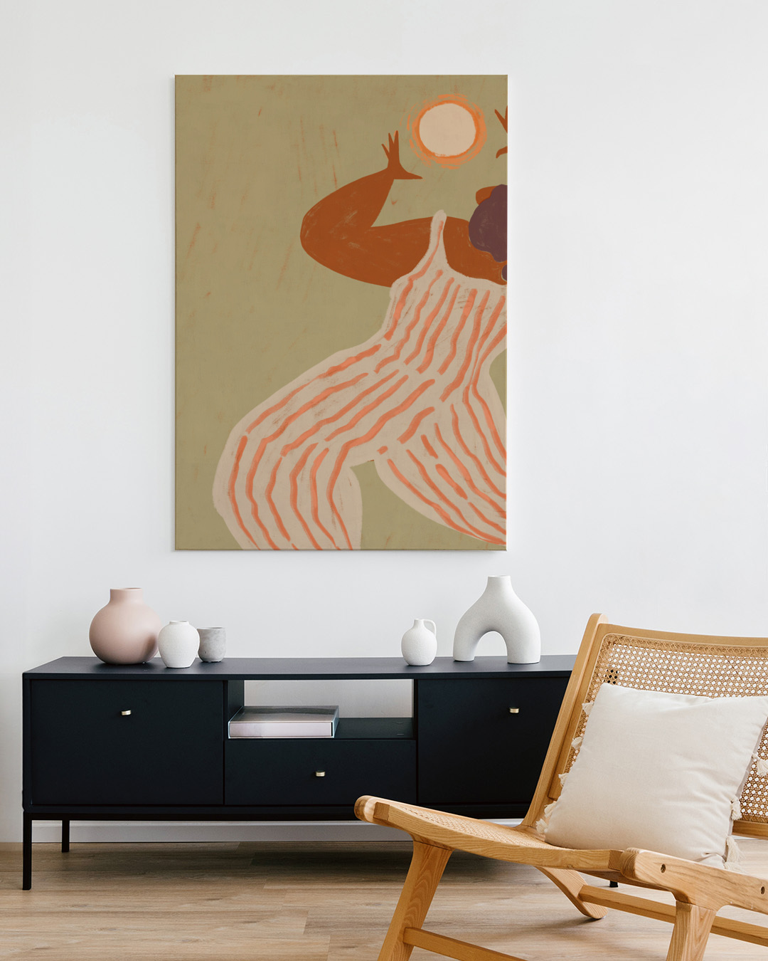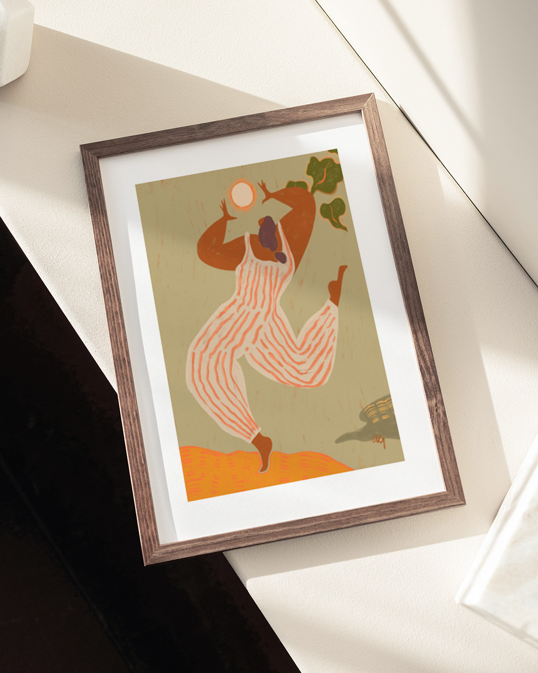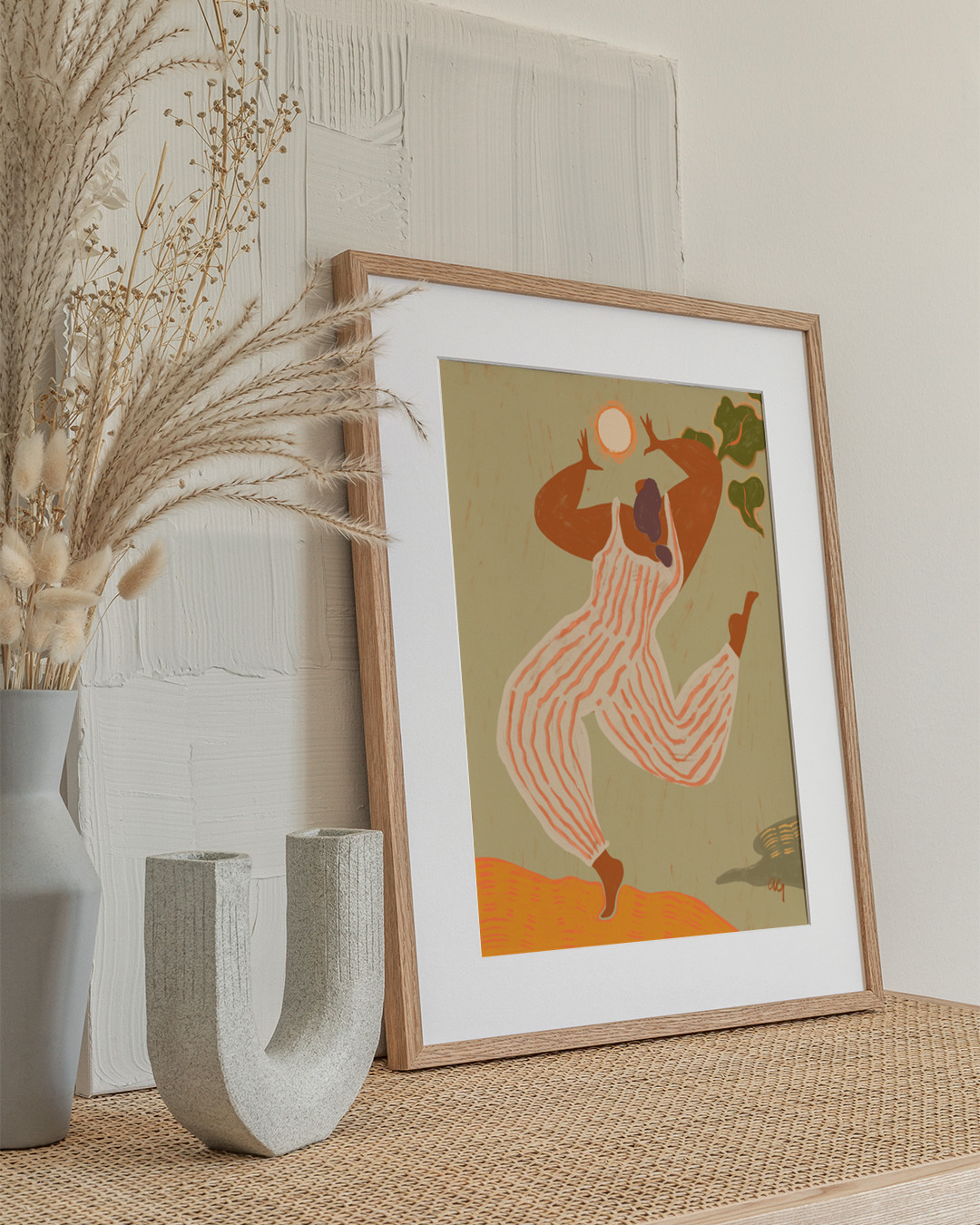 This artistic illustration by Arty Guava features a playful figure in a striped jumpsuit reaching energetically for the sun against a soft earthy backdrop enriched with green.