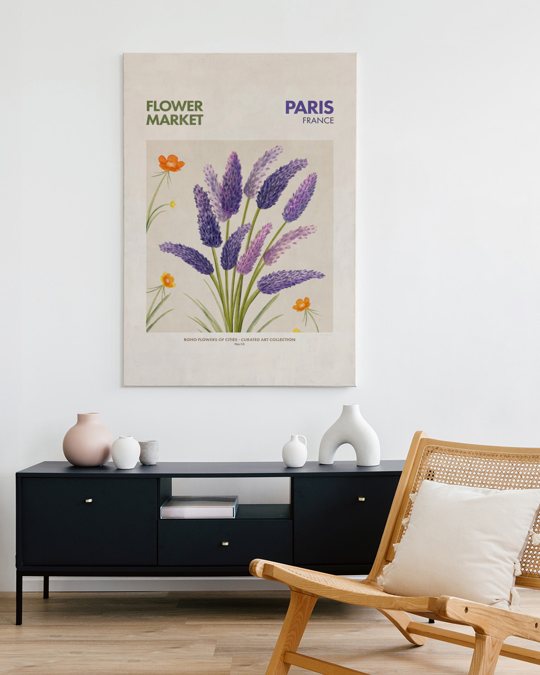 The stretched canvas is fitted with a sleek float frame in genuine wood for an elegant finish and extra dimension. The space between the canvas and the frame creates a floating effect.