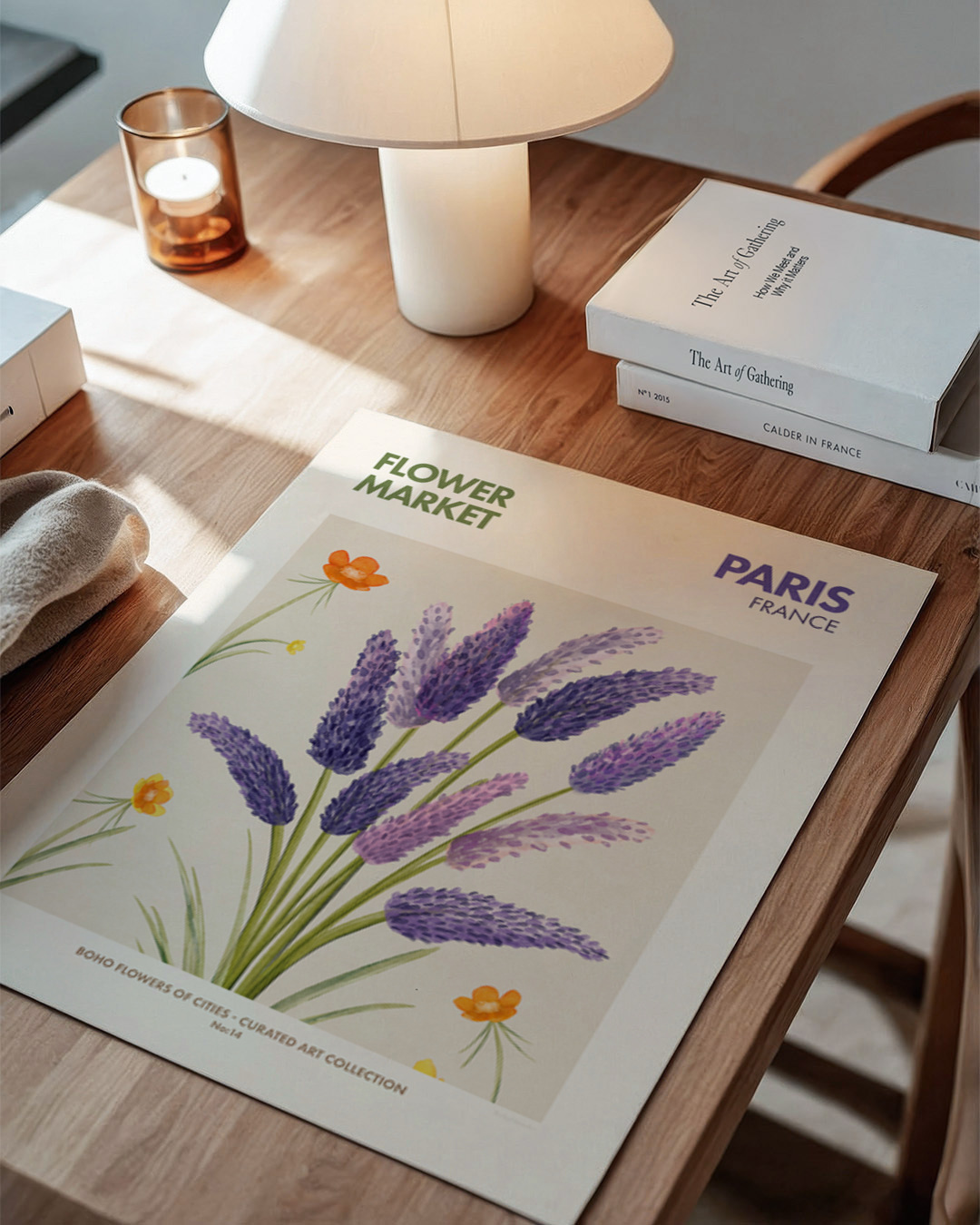 Discover a vivid illustration by Emel Tunaboylu capturing the charm of a Parisian flower market with vibrant purple and orange flowers. An elegant depiction of seasonal blooms conveying the essence of Paris in full flourish.