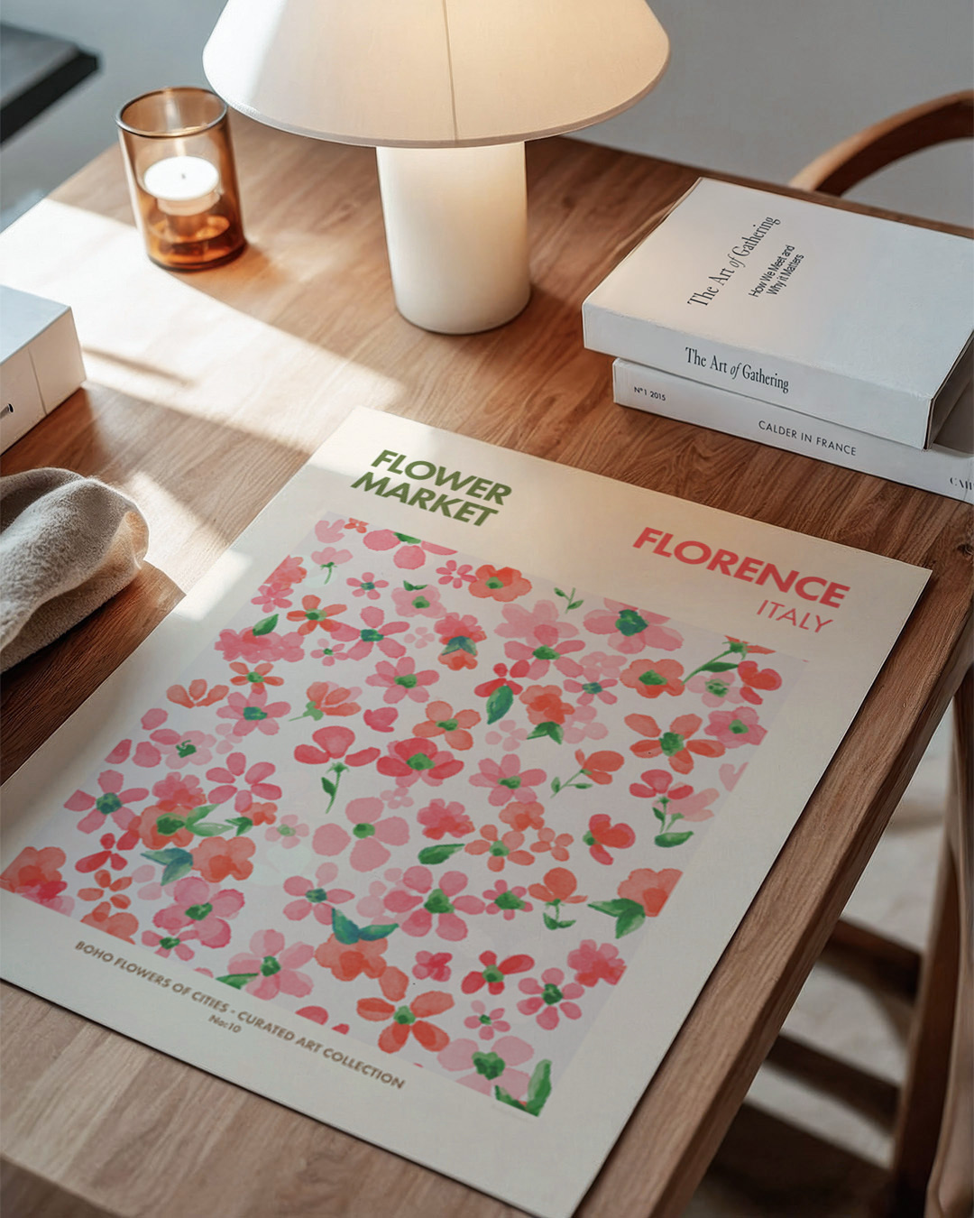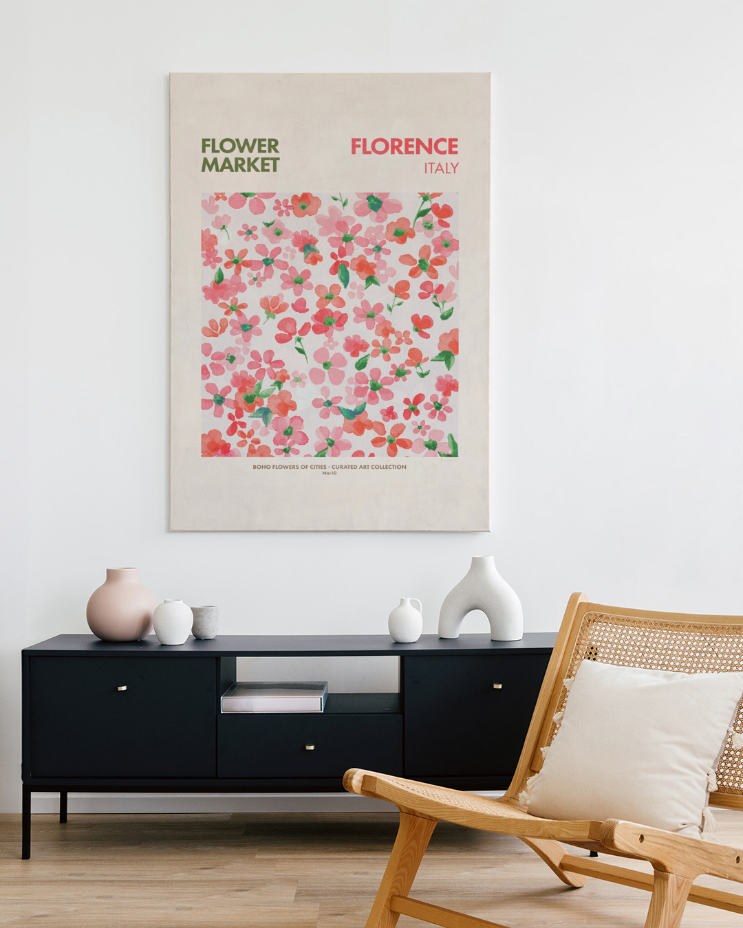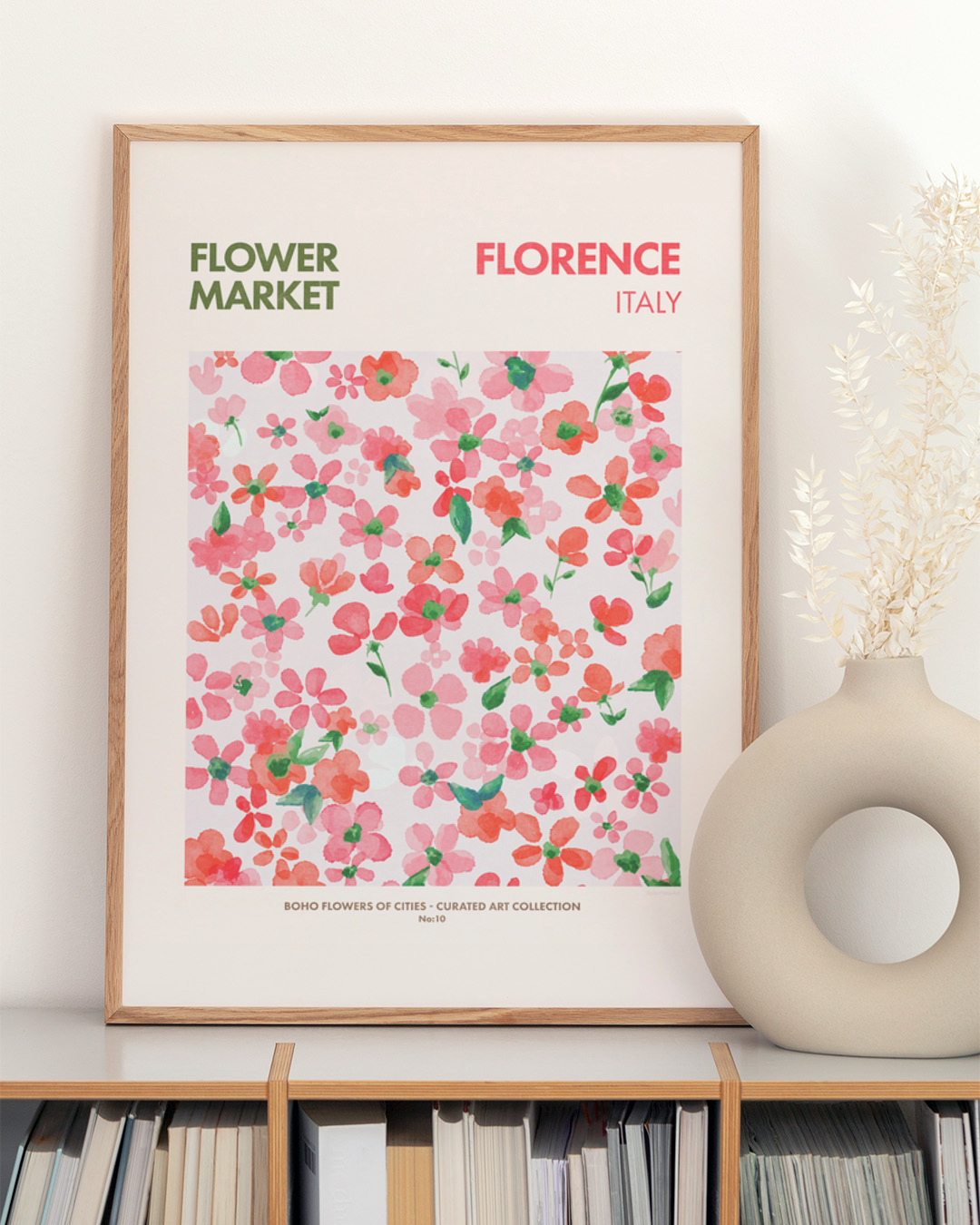 The illustration by Emel Tunaboylu features a vibrant boho-inspired floral pattern. The mix of red and pink flowers exudes a lively and playful charm.