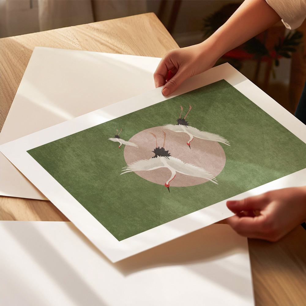 An artistic representation of red-crowned cranes soaring across a forest green backdrop, capturing their majestic and elegant flight in graceful motion. This piece by Emel Tunaboylu showcases these beautiful birds in a captivating manner.