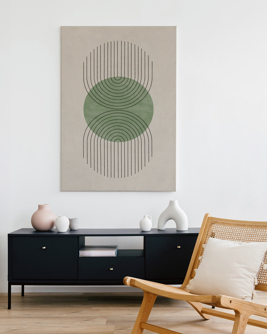 A geometrically inspired print featuring a symmetry of black lines over a muted green center, set against a beige backdrop. Perfect for adding a touch of minimalist elegance to any space.