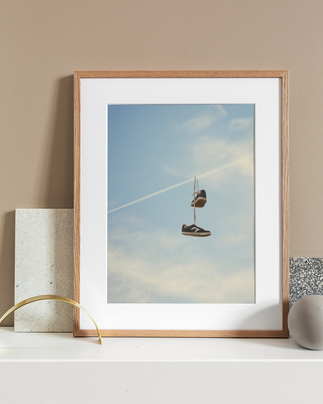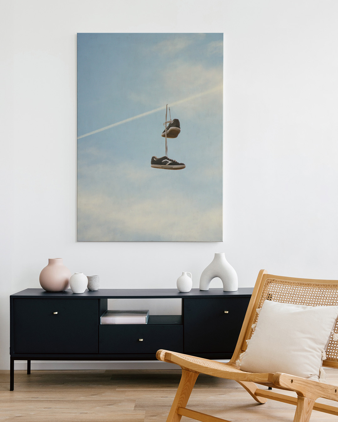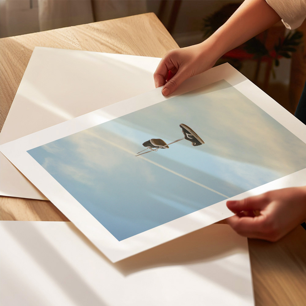This whimsical digital art piece depicts a pair of sneakers hanging humorously on a plane's contrail. The surreal imagery combines photography and digital editing to create a playful scene in the sky.