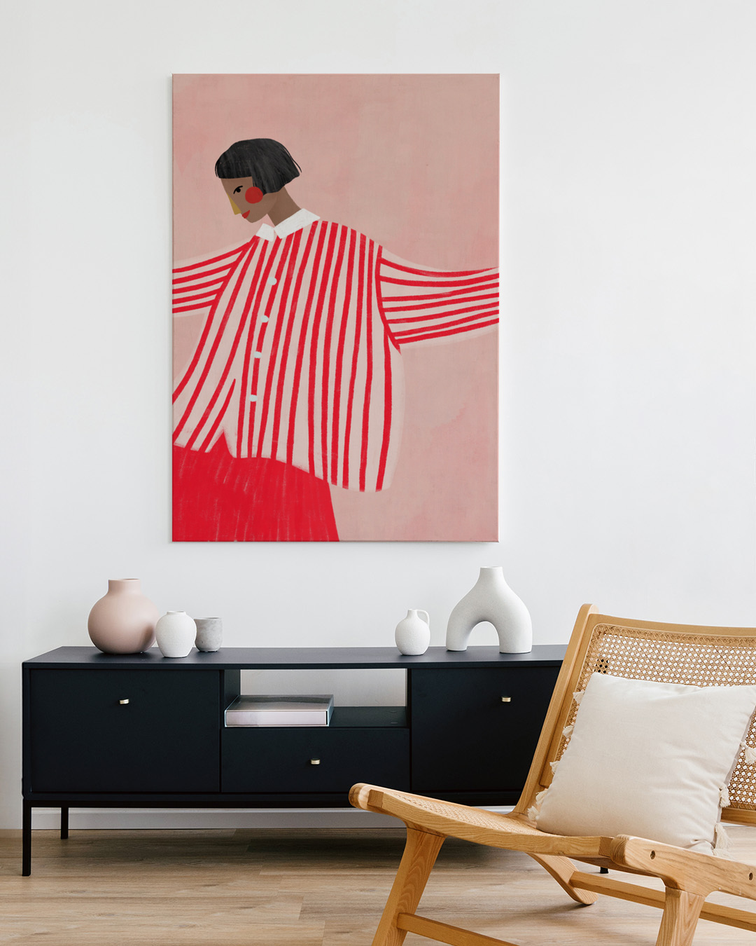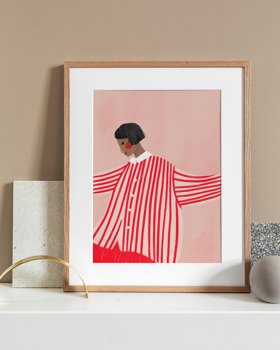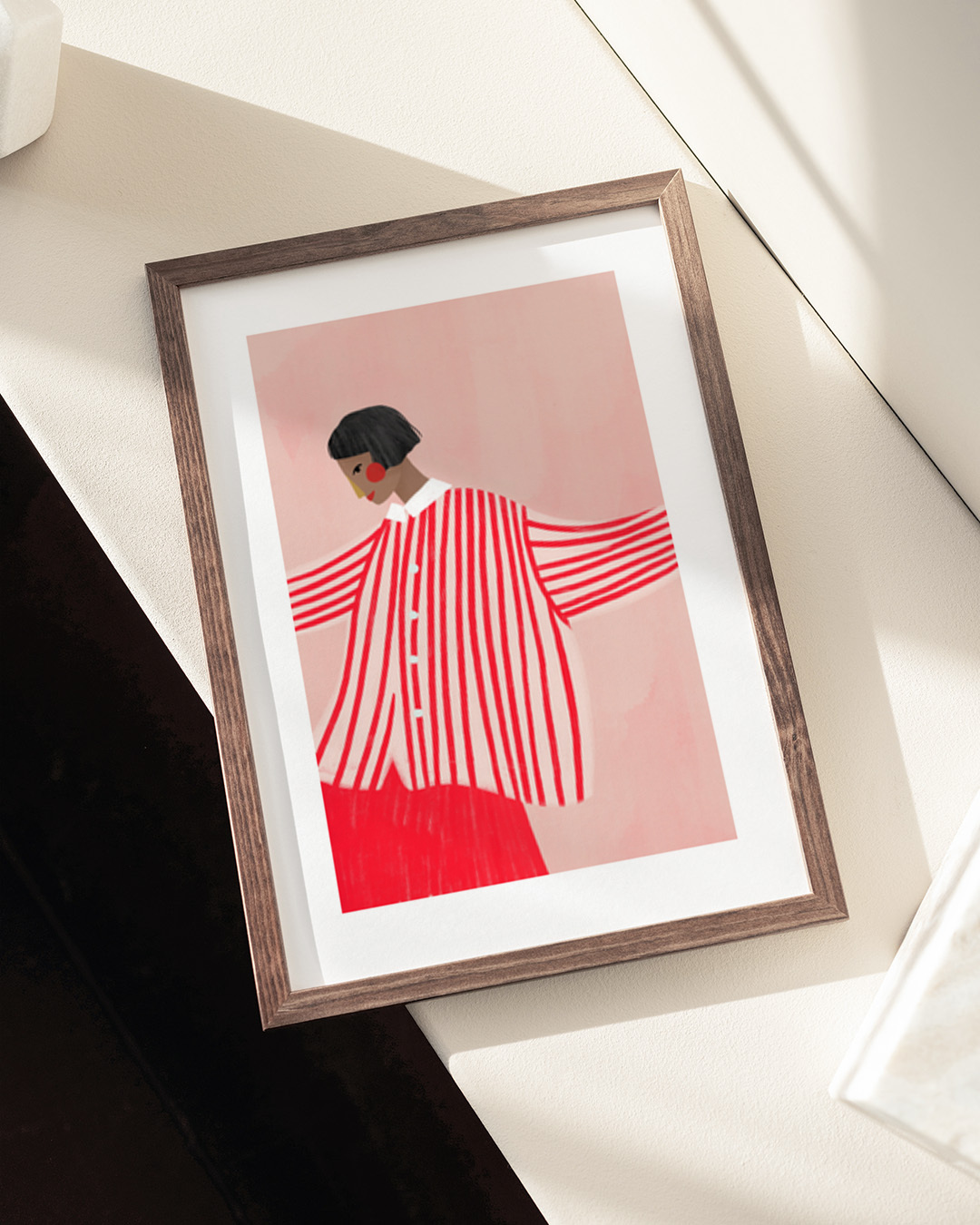 Bea Müller captures the essence of fashion with this illustration featuring a stylish woman wearing red striped clothing against a soft backdrop. The contrast of colors highlights a sense of boldness and elegance.