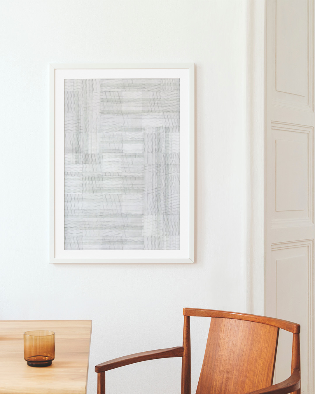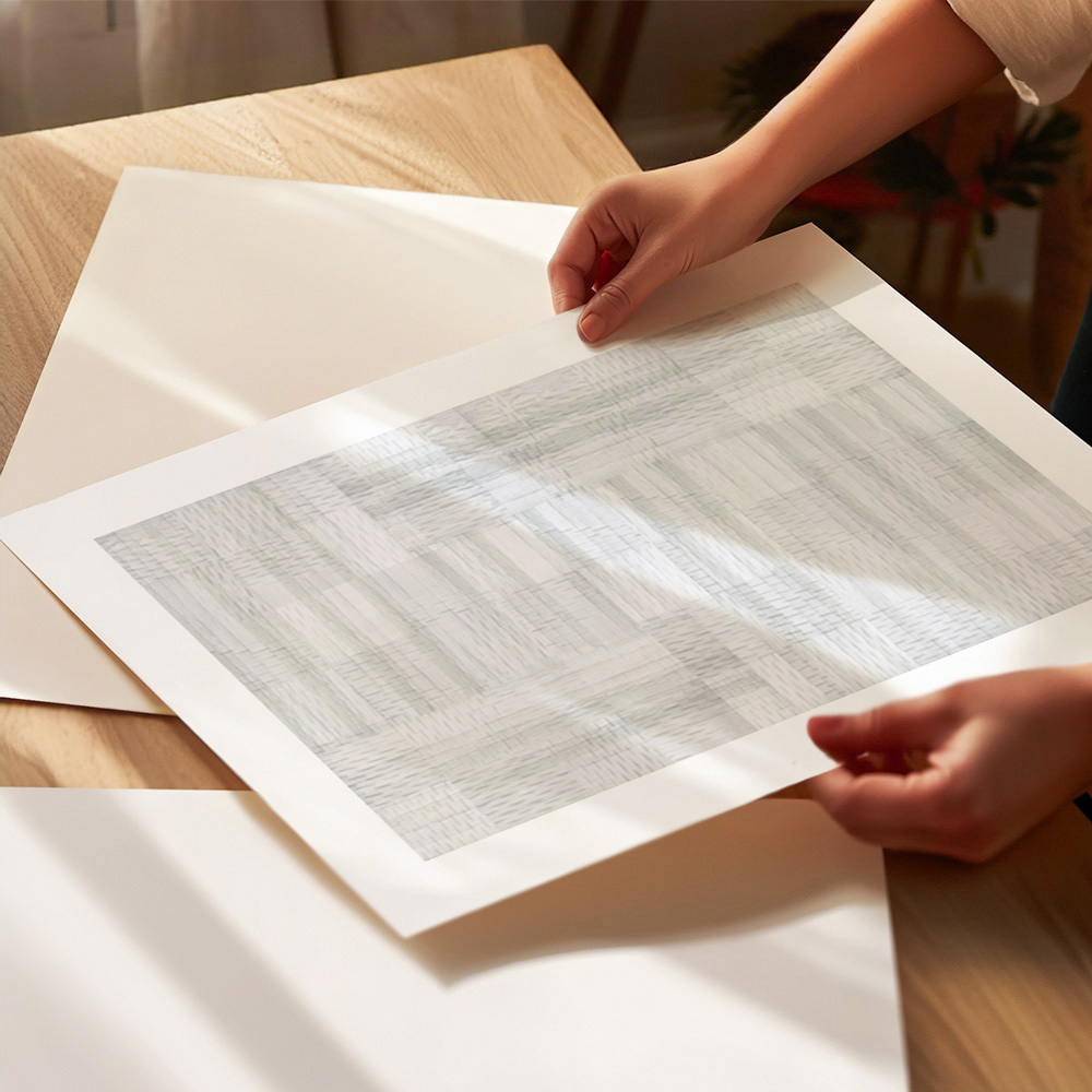 Explore intricate geometric patterns in this art print with subtle woven-like textures, offering a contemporary and calming aesthetic. The delicate interplay of lines and soft hues create a sophisticated design that complements modern spaces.
