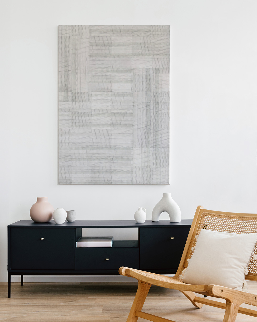 The stretched canvas is fitted with a sleek float frame in genuine wood for an elegant finish and extra dimension. The space between the canvas and the frame creates a floating effect.
