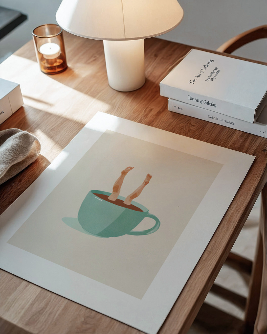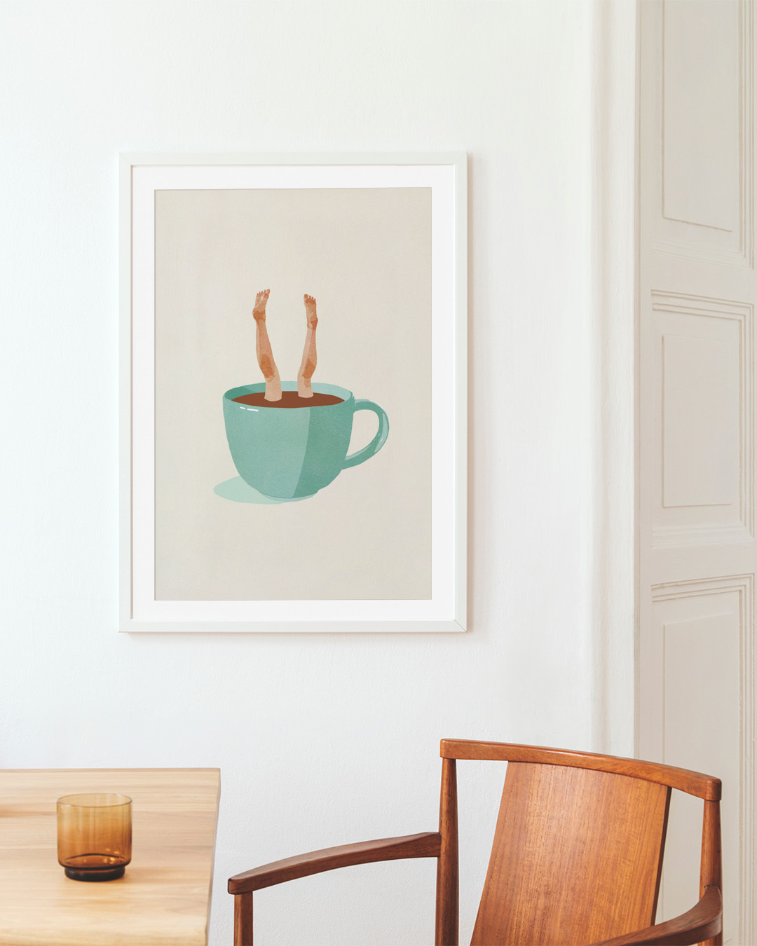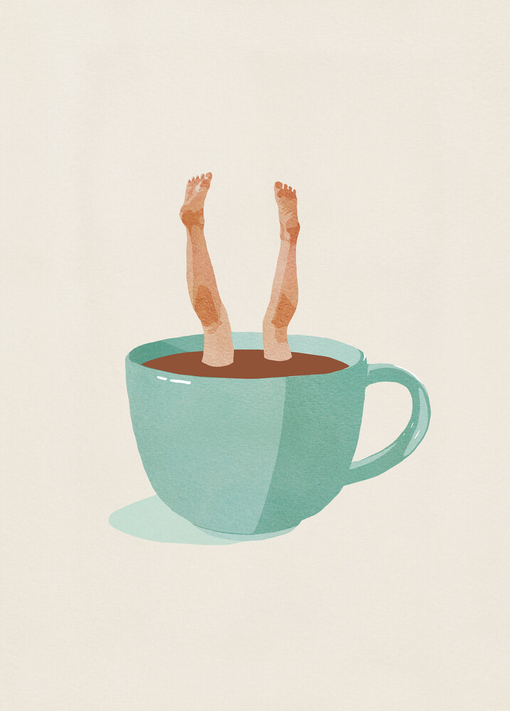 A whimsical illustration by Giselle Dekel featuring two legs sticking out of a turquoise coffee cup, surrounded by coffee. Perfect for coffee lovers and fans of surreal art.