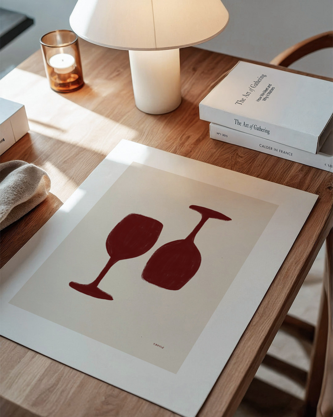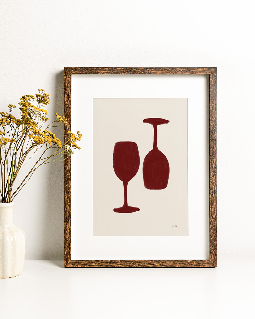 A minimalist design featuring the silhouette of a wine glass and an inverted glass. The bold red contrasts sharply with the light beige background, adding elegance to any space. Perfect for wine enthusiasts.