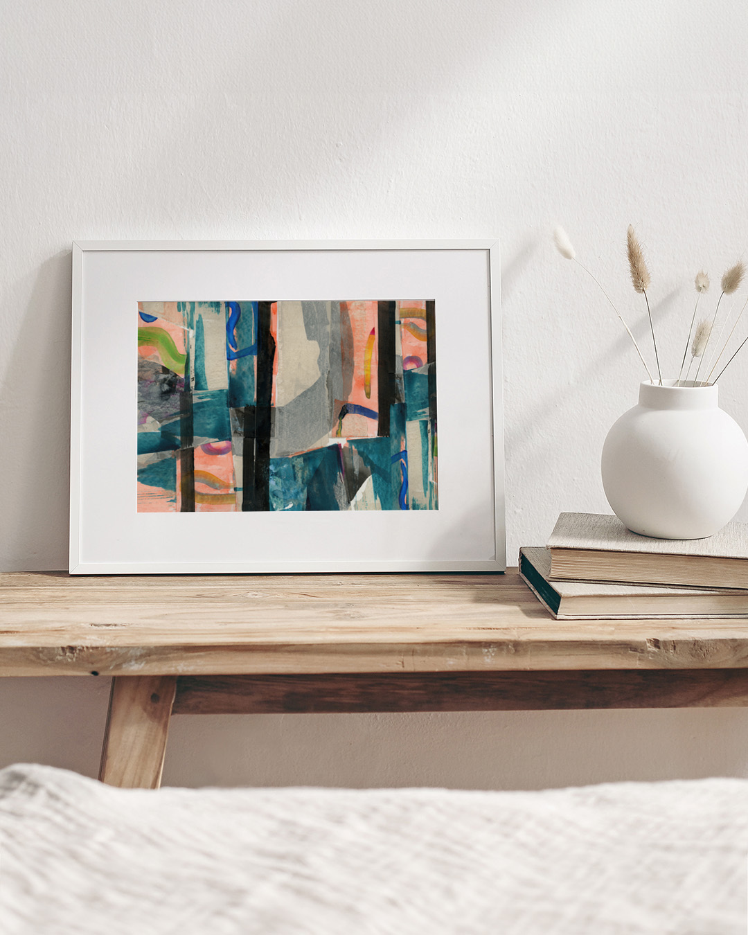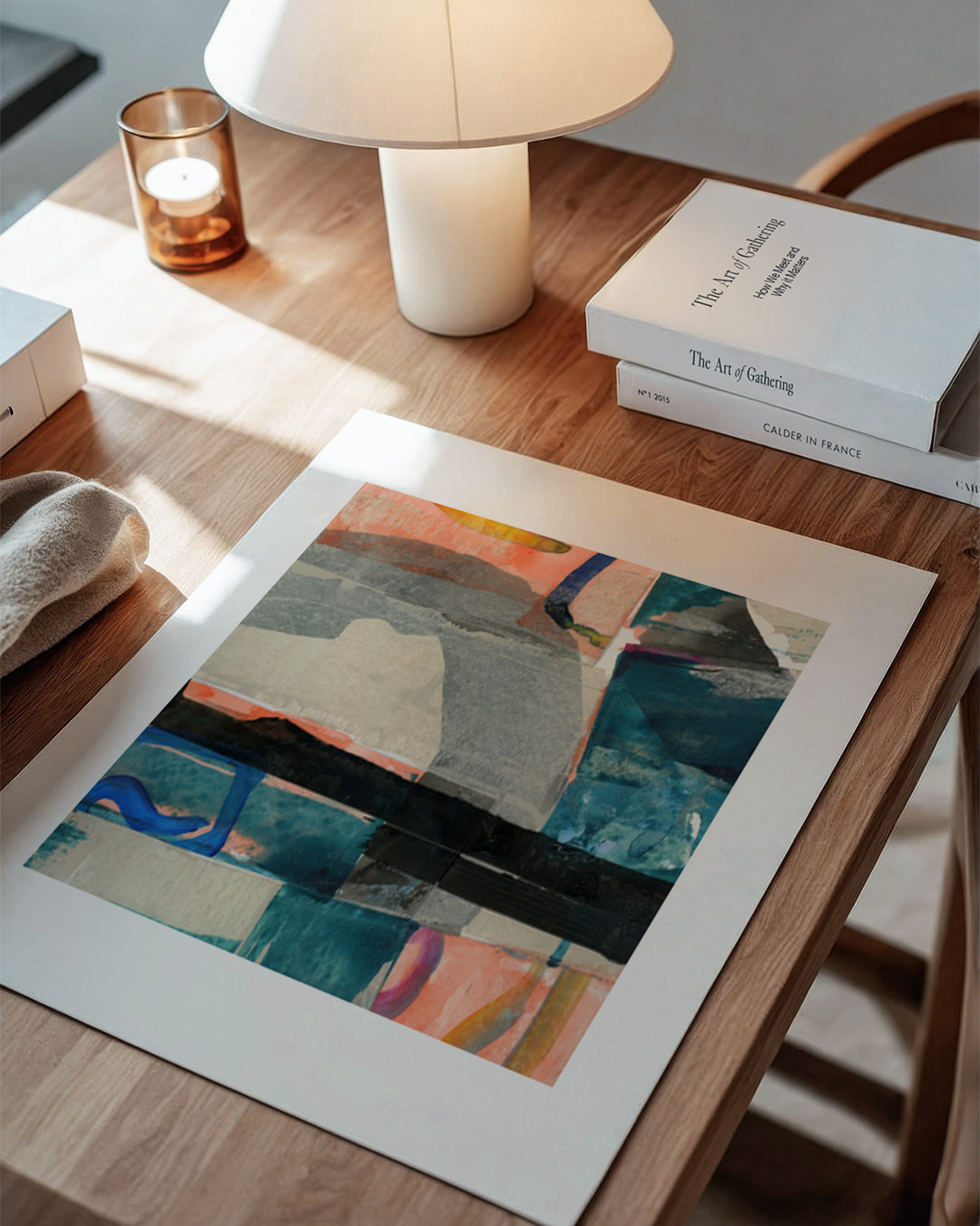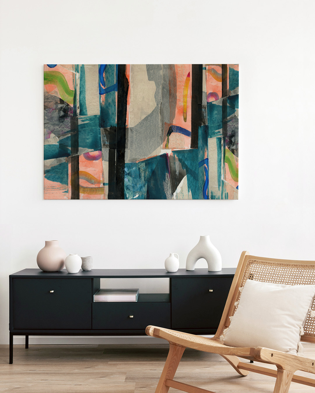 This dynamic abstract composition brings together vivid shapes and striking colours, creating a visually engaging tapestry of artistic expression.