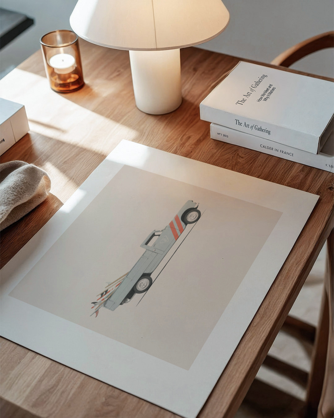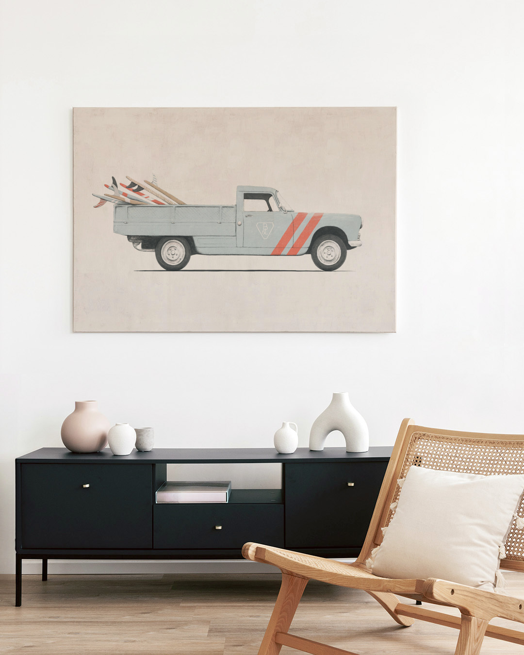 Capture the charm of the coast with this graphic of a retro blue pickup truck carrying surfboards. Florent Bodart brings beach vibes through a nostalgic take on vehicular design.