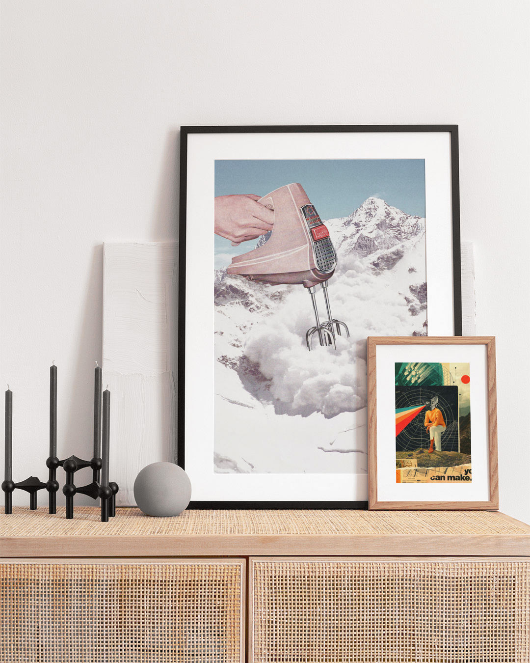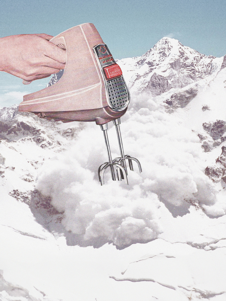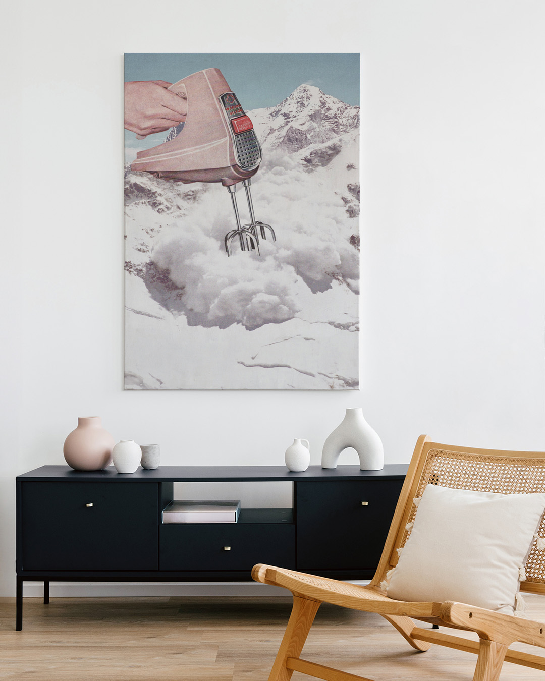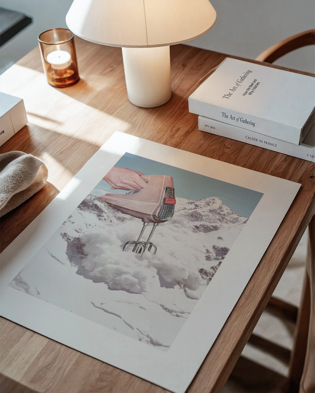 A whimsical scene merging a vintage hand mixer with a snow-covered mountain backdrop, creating a unique and imaginative landscape. Perfect for those who appreciate playful and abstract art.