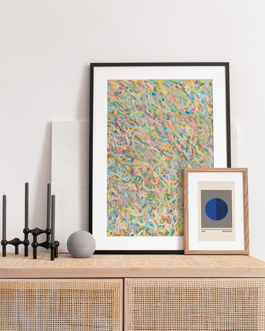 The stretched canvas is fitted with a sleek float frame in genuine wood for an elegant finish and extra dimension. The space between the canvas and the frame creates a floating effect.