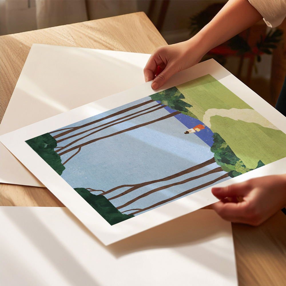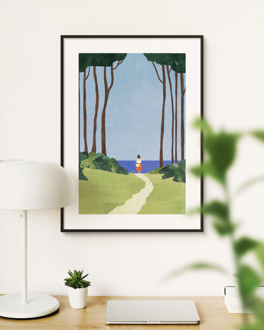 A tranquil illustration depicting a woman gazing over the blue sea surrounded by tall pine trees and lush greenery on a peaceful day.