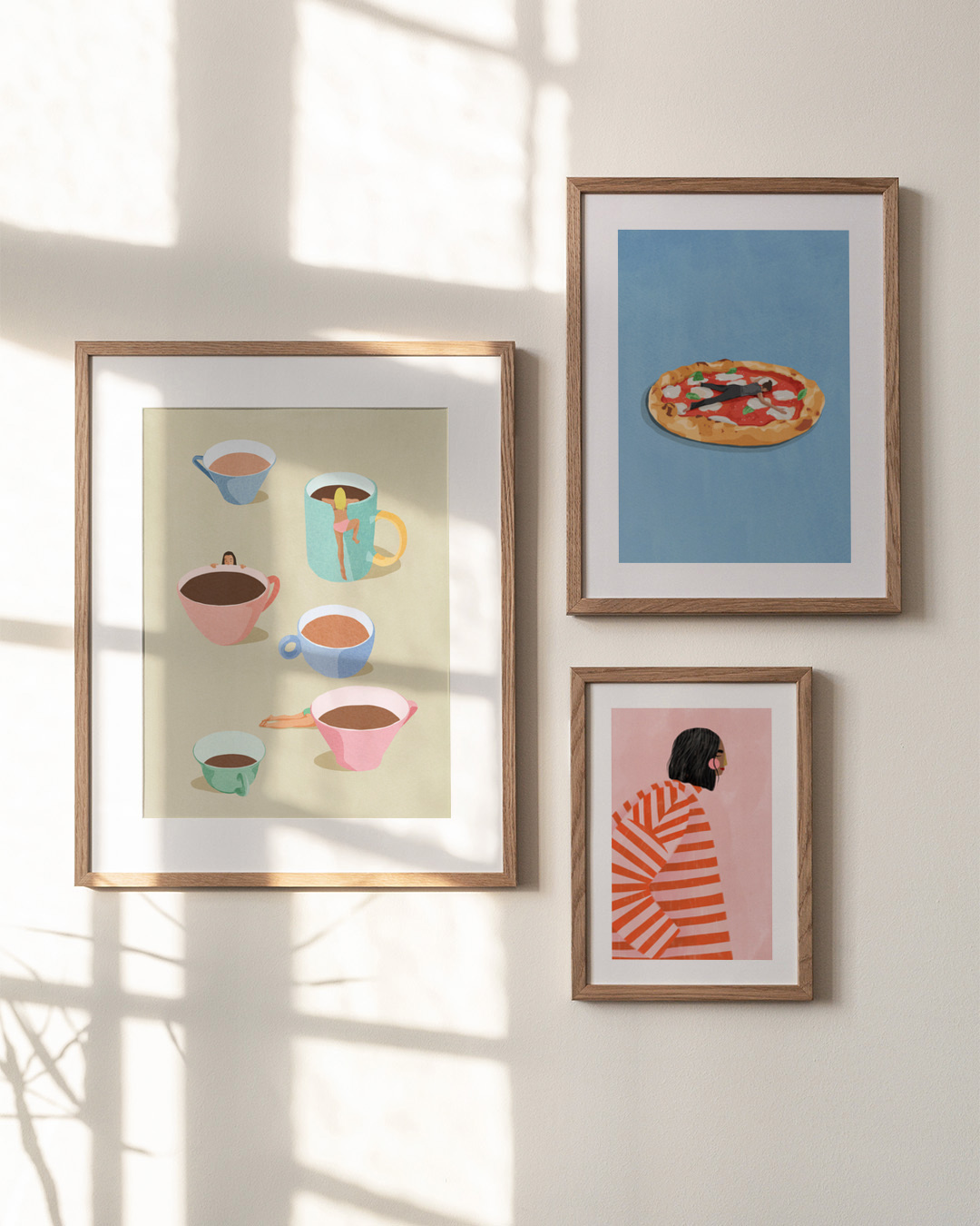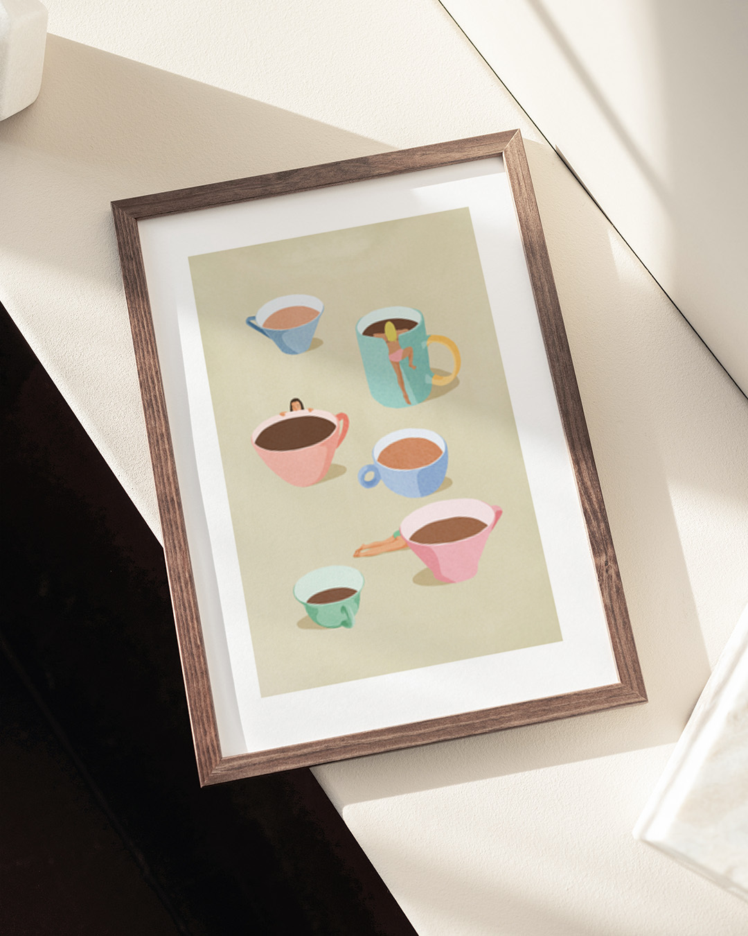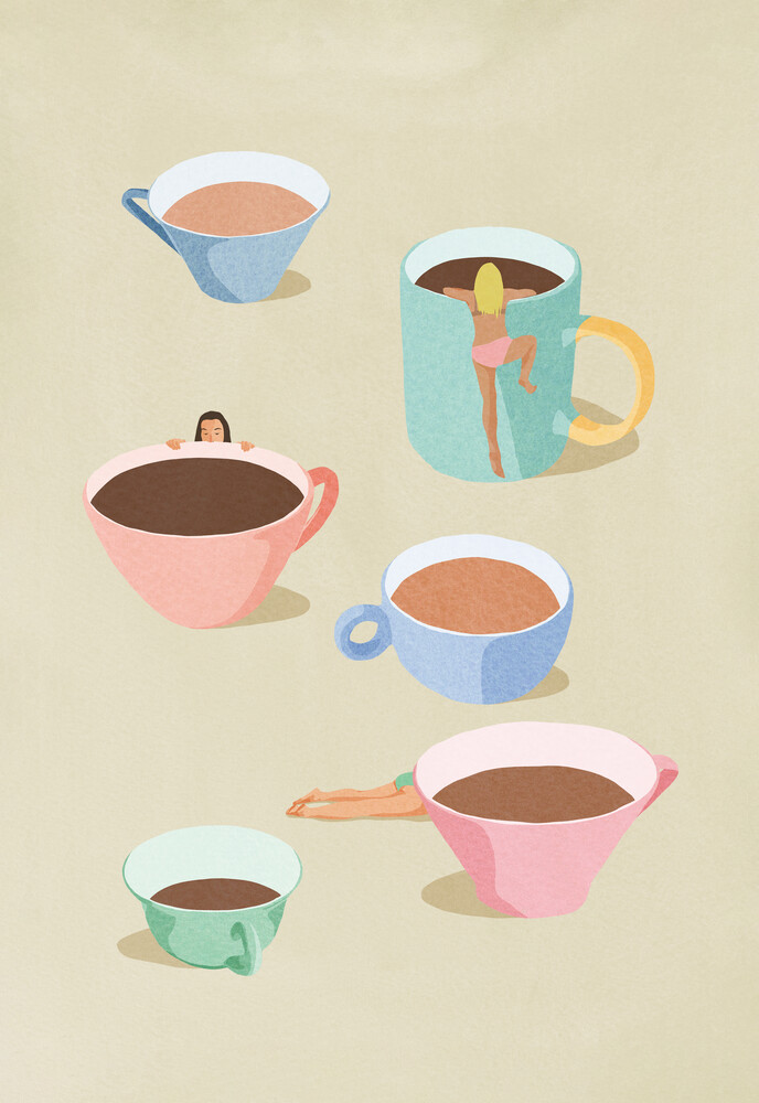 Playful illustration by Giselle Dekel featuring women interacting with oversized coffee mugs, adding a whimsical twist to everyday moments. The artwork showcases pastel colours, combining gastronomy and human figures in a unique composition.