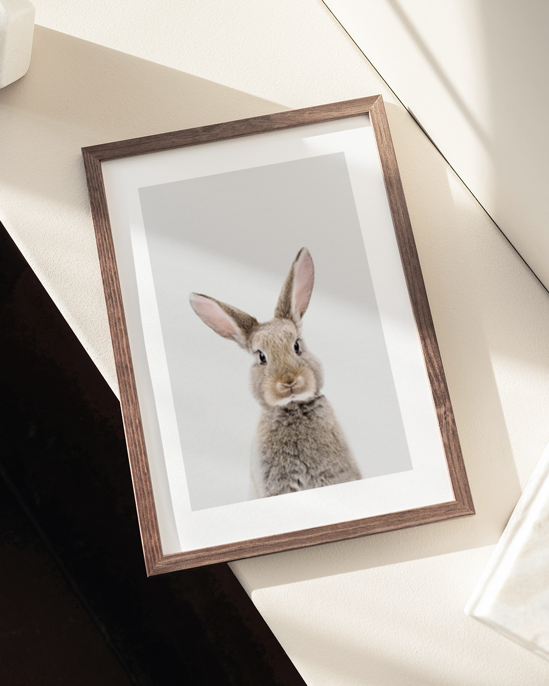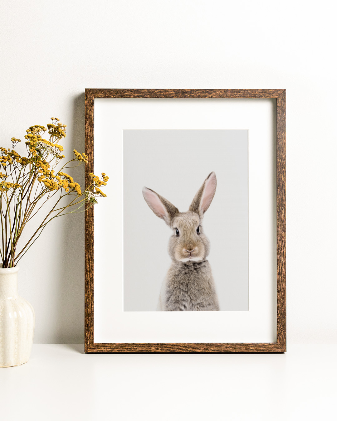Kathrin Pienaar's charming portrait of a baby rabbit against a plain backdrop highlights its delicate features and gentle demeanor, making it a delightful addition to any child's room.