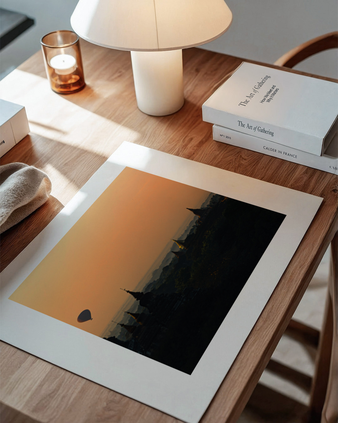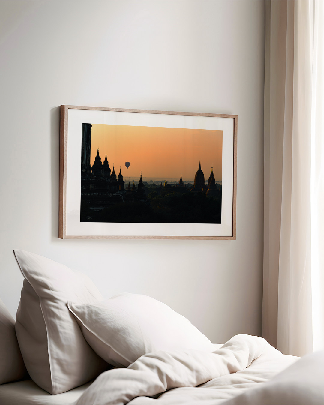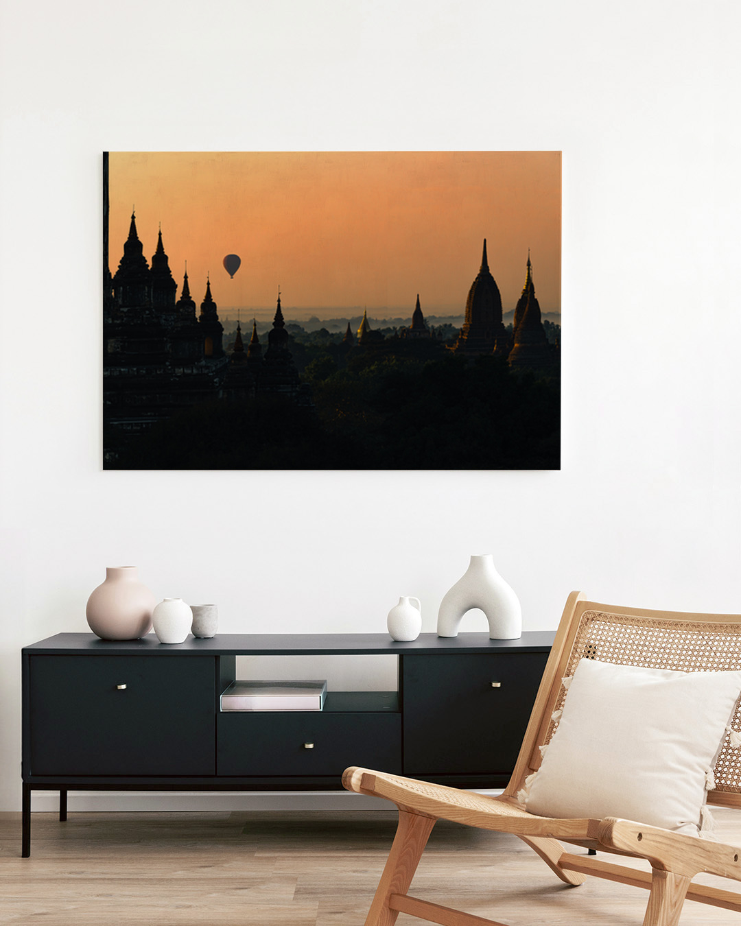 Capture the enchanting beauty of a hot air balloon floating over the ancient temples of Bagan at sunrise. This serene scene showcases the architectural splendor and natural beauty of this historic site.