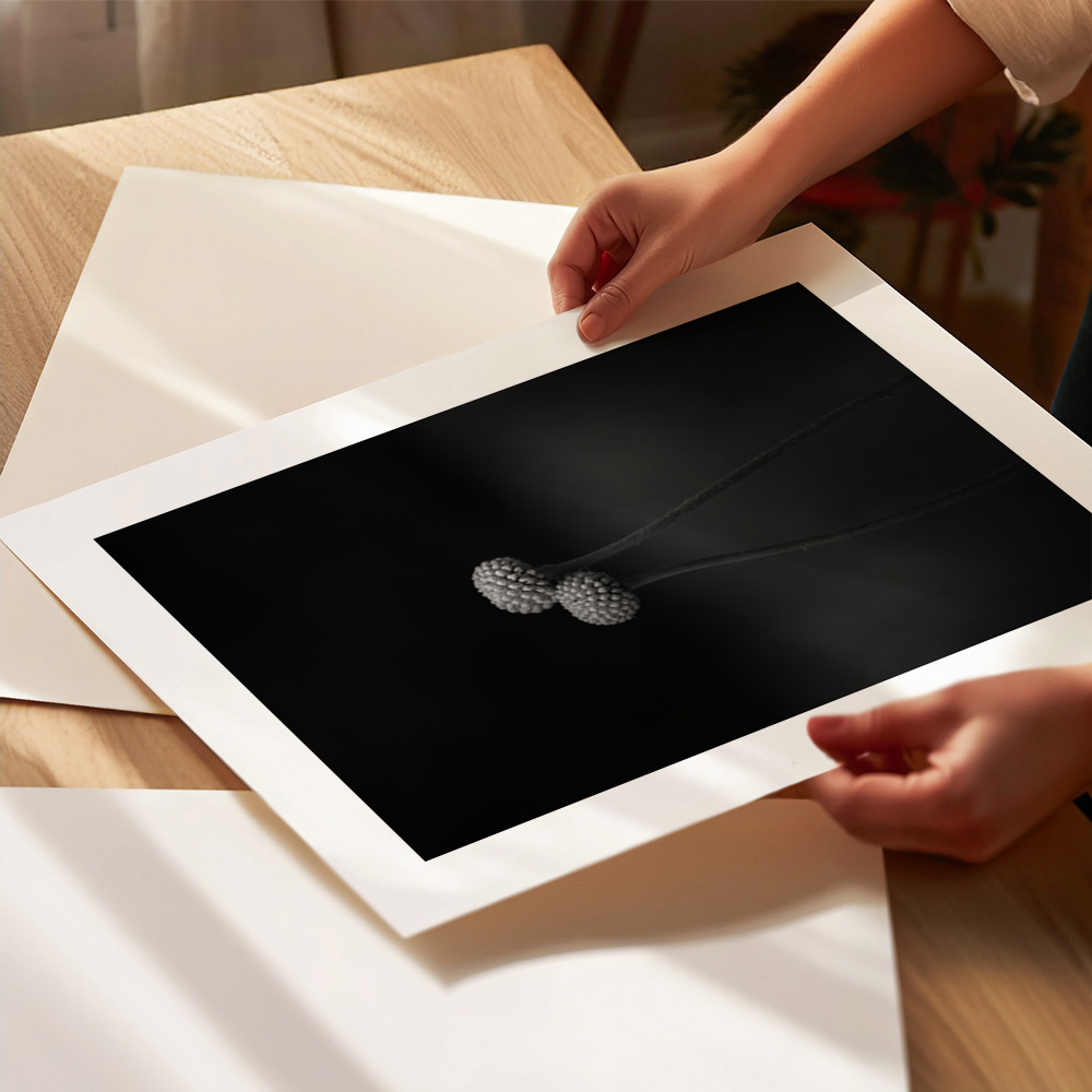 Black-and-white photographic depiction of two billy buttons (Pycnosorus) flower stems against a dark background. Captures the delicate beauty of twin blossoms in monochrome.