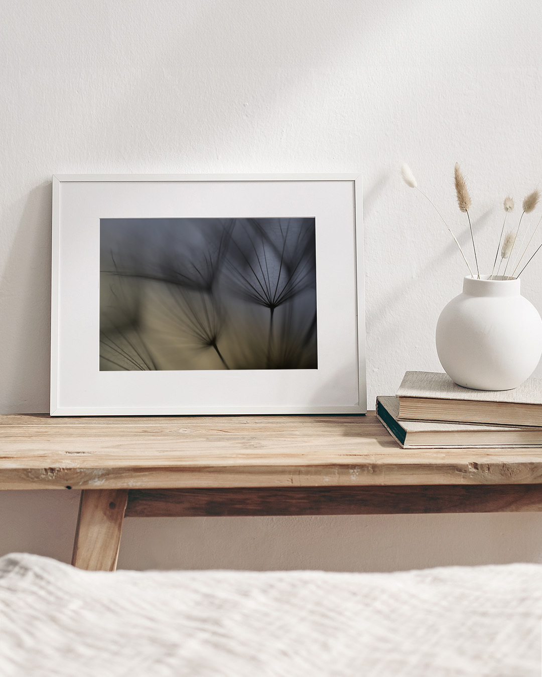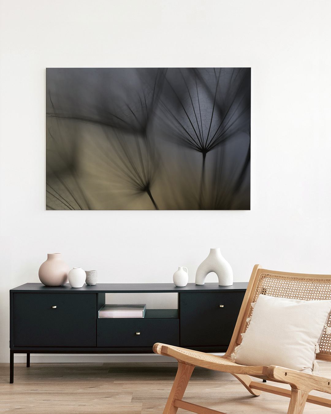 The stretched canvas is fitted with a sleek float frame in genuine wood for an elegant finish and extra dimension. The space between the canvas and the frame creates a floating effect.
