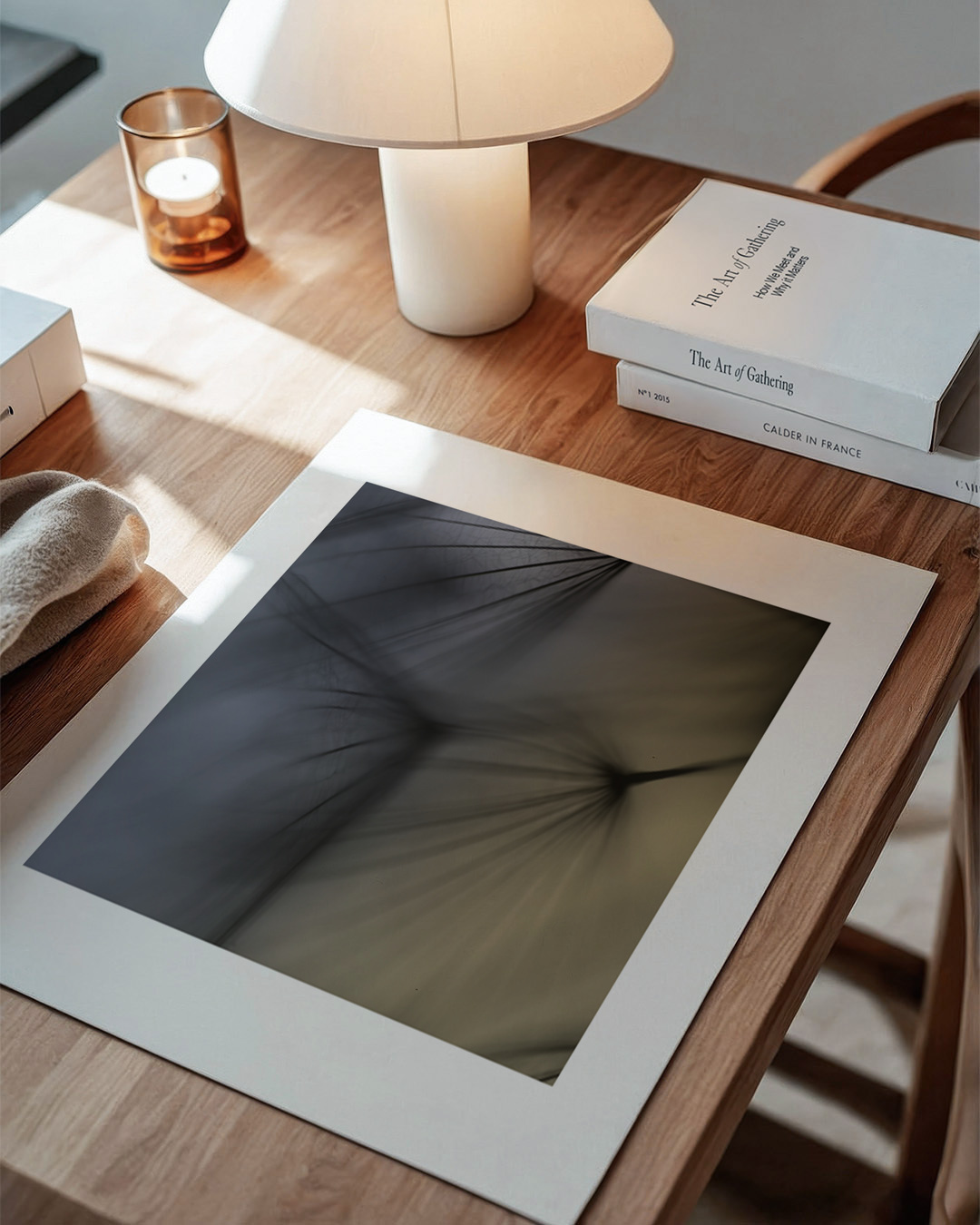 A delicate and abstract macro photograph capturing the intricate details of Tragopogon seedheads. Soft beige and gray colors create a calming and ethereal atmosphere.