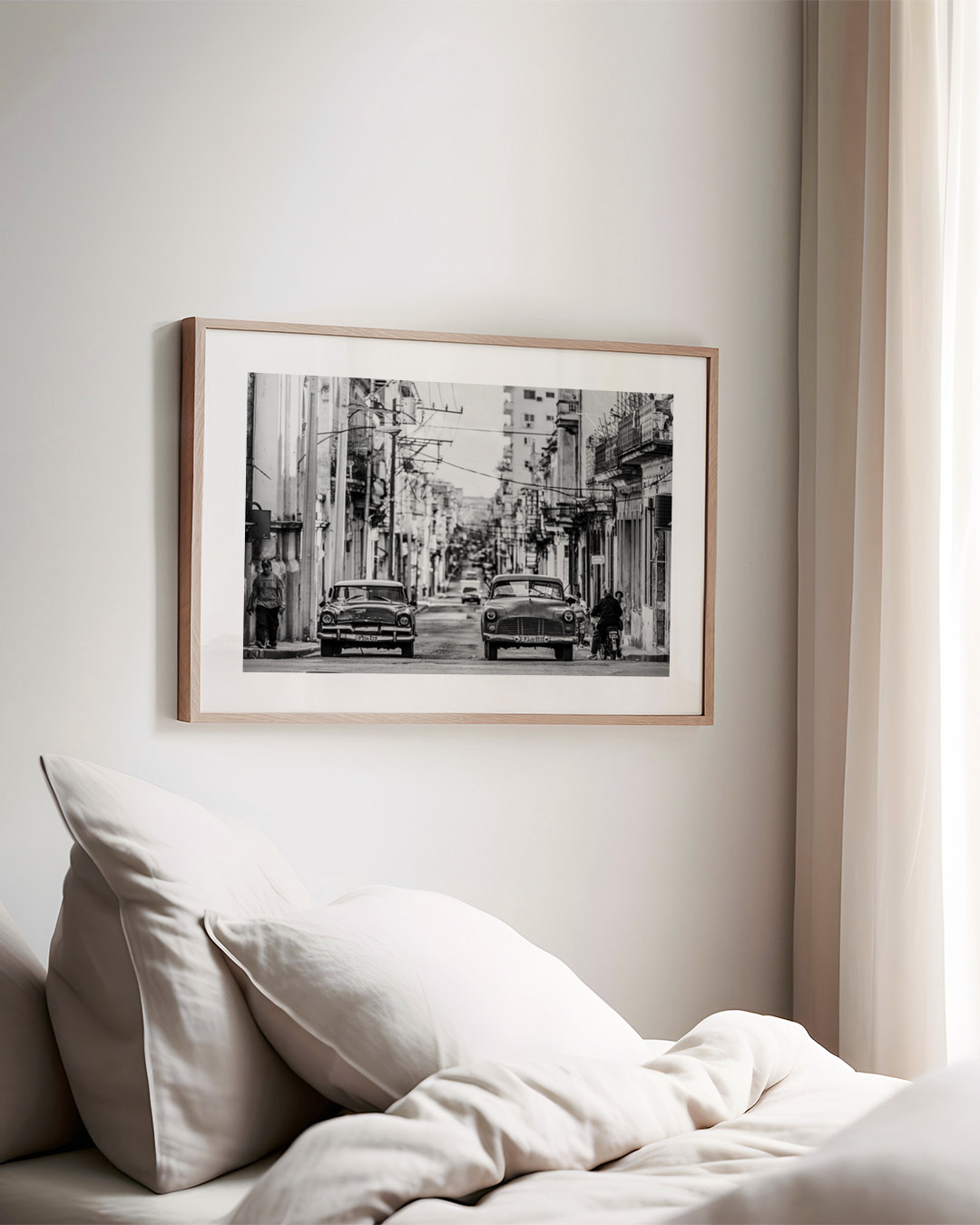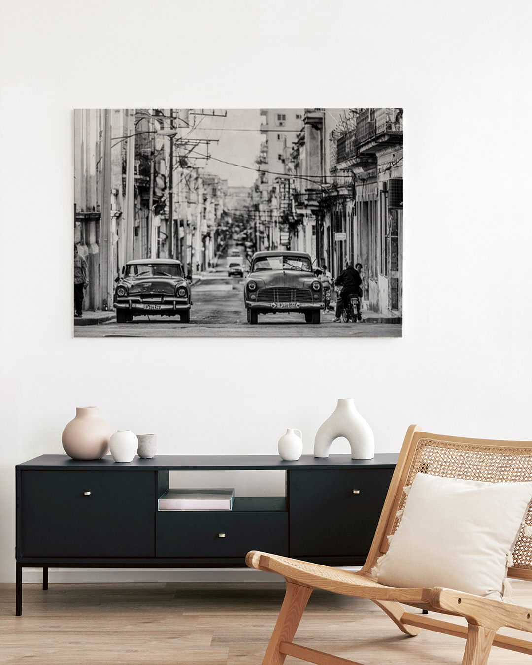 This black and white photograph captures a lively street in Havana. The iconic vintage cars and the rustic architecture transport you back in time, offering a nostalgic glimpse into Cuban culture.