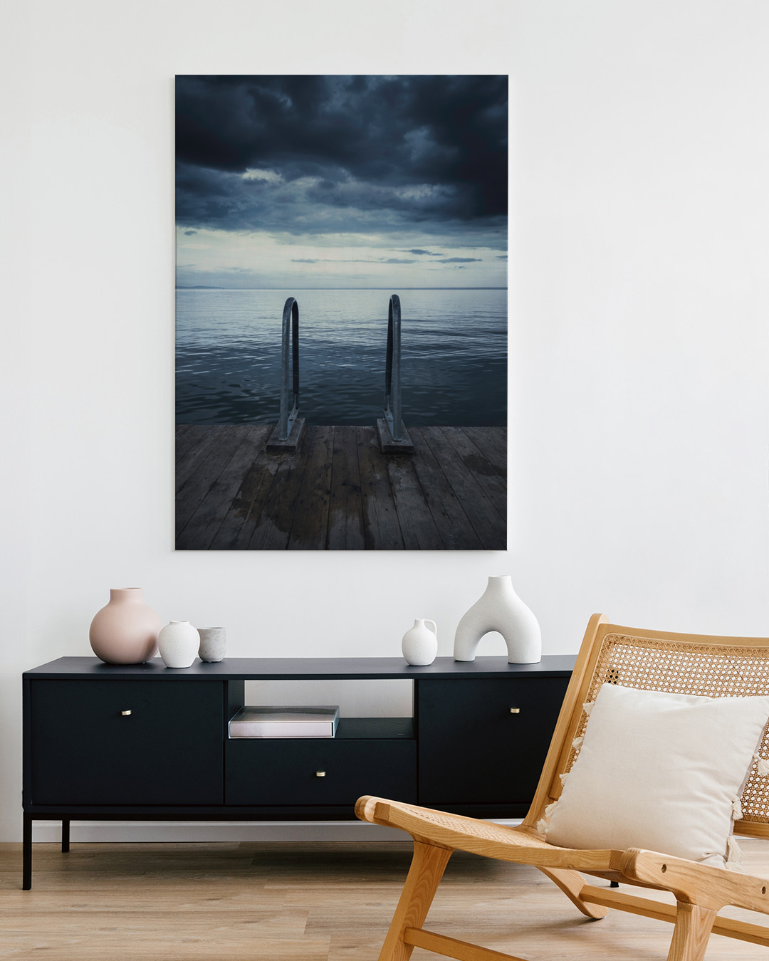 The stretched canvas is fitted with a sleek float frame in genuine wood for an elegant finish and extra dimension. The space between the canvas and the frame creates a floating effect.