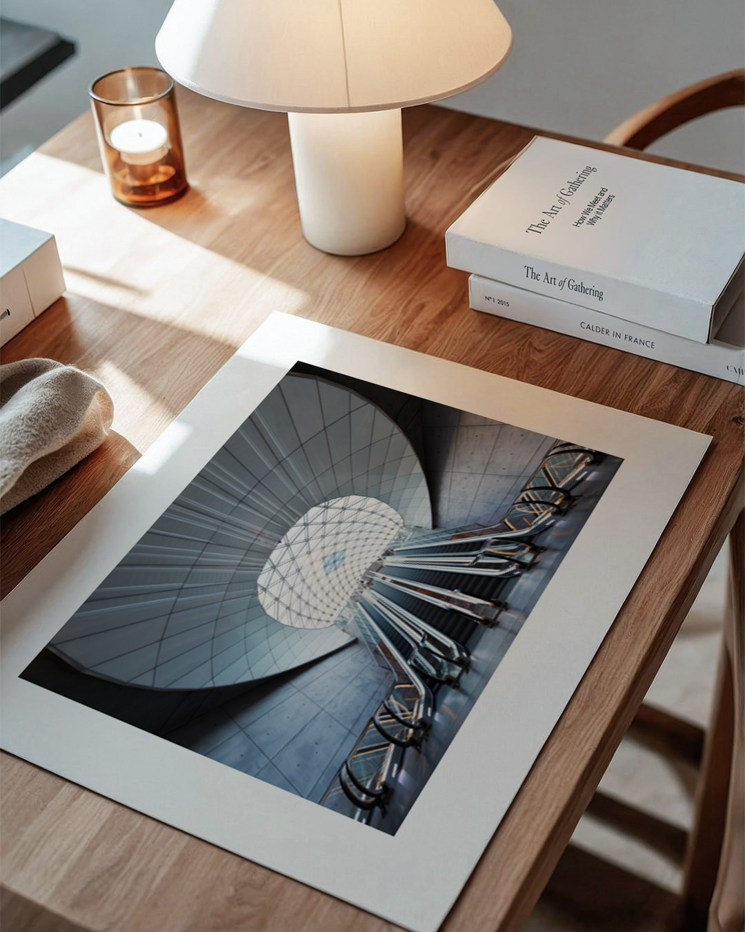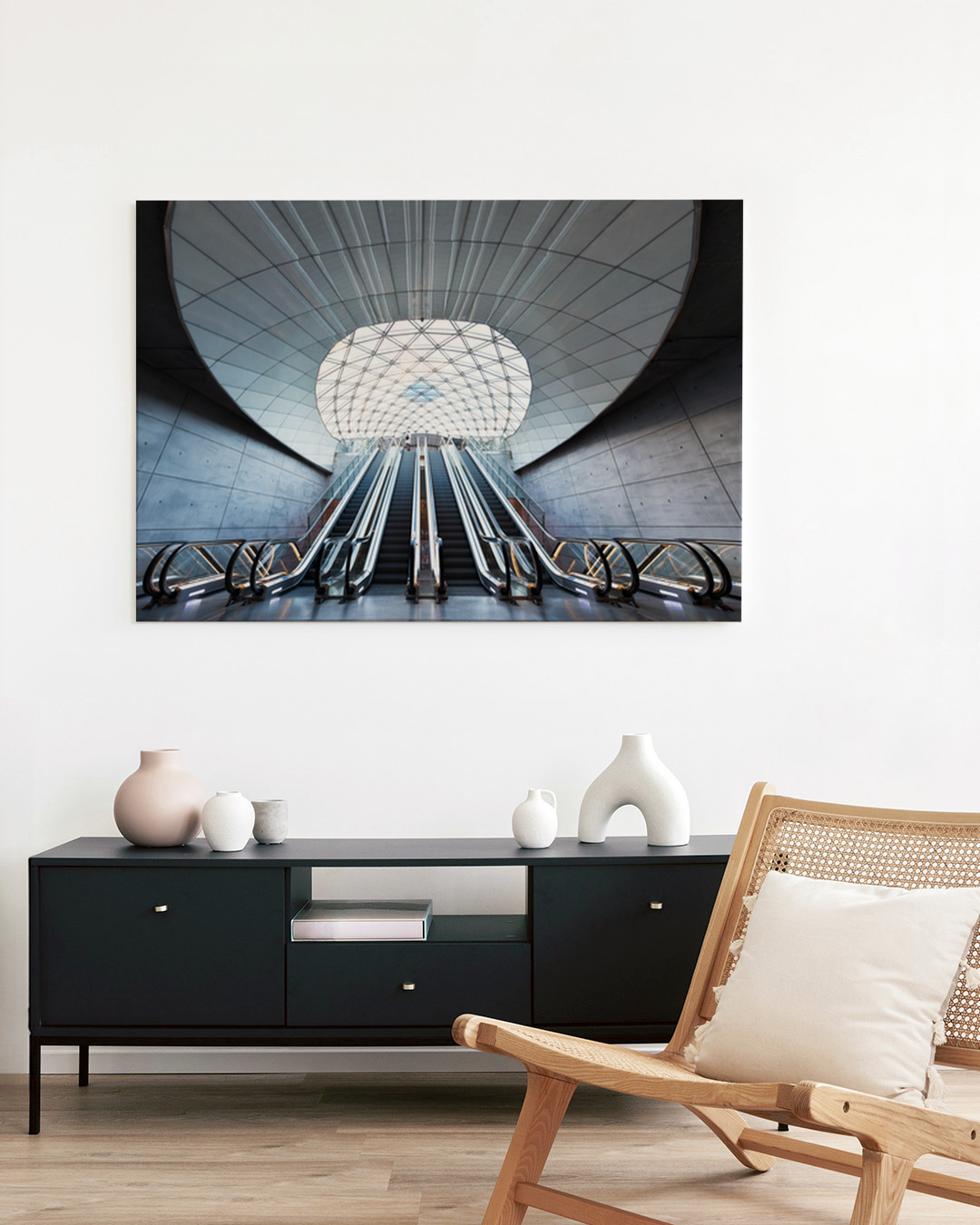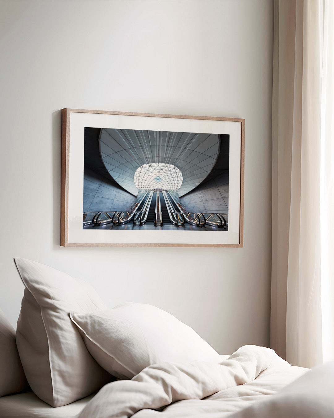 A captivating photograph of the modern escalators at Triangeln station in Malmö. The image showcases the sleek architectural design and urban feel, reflecting a blend of travel and innovation.