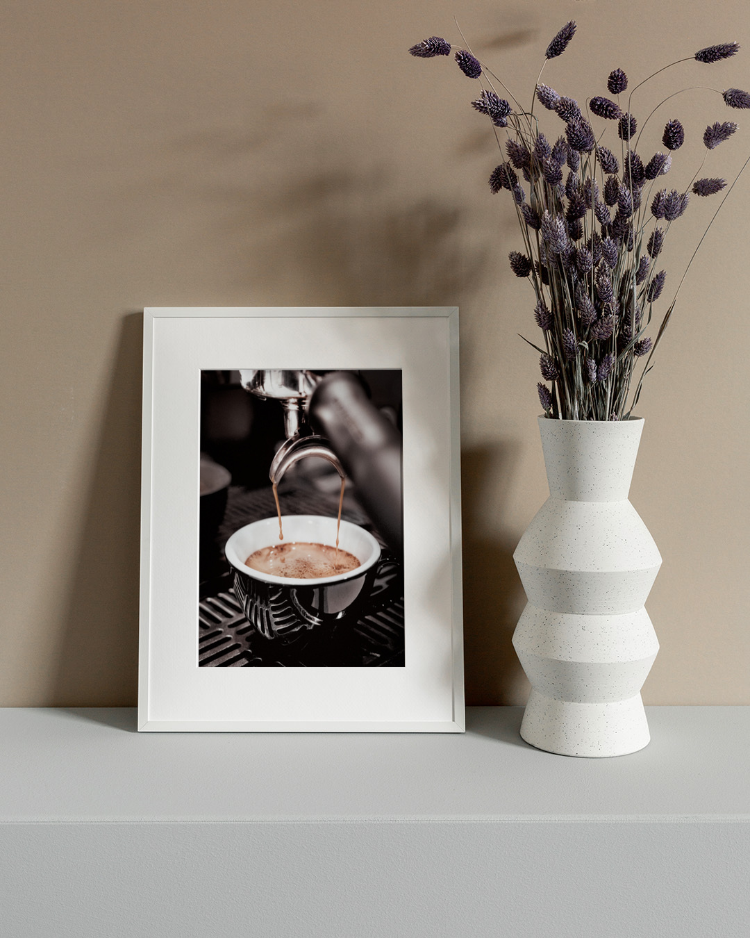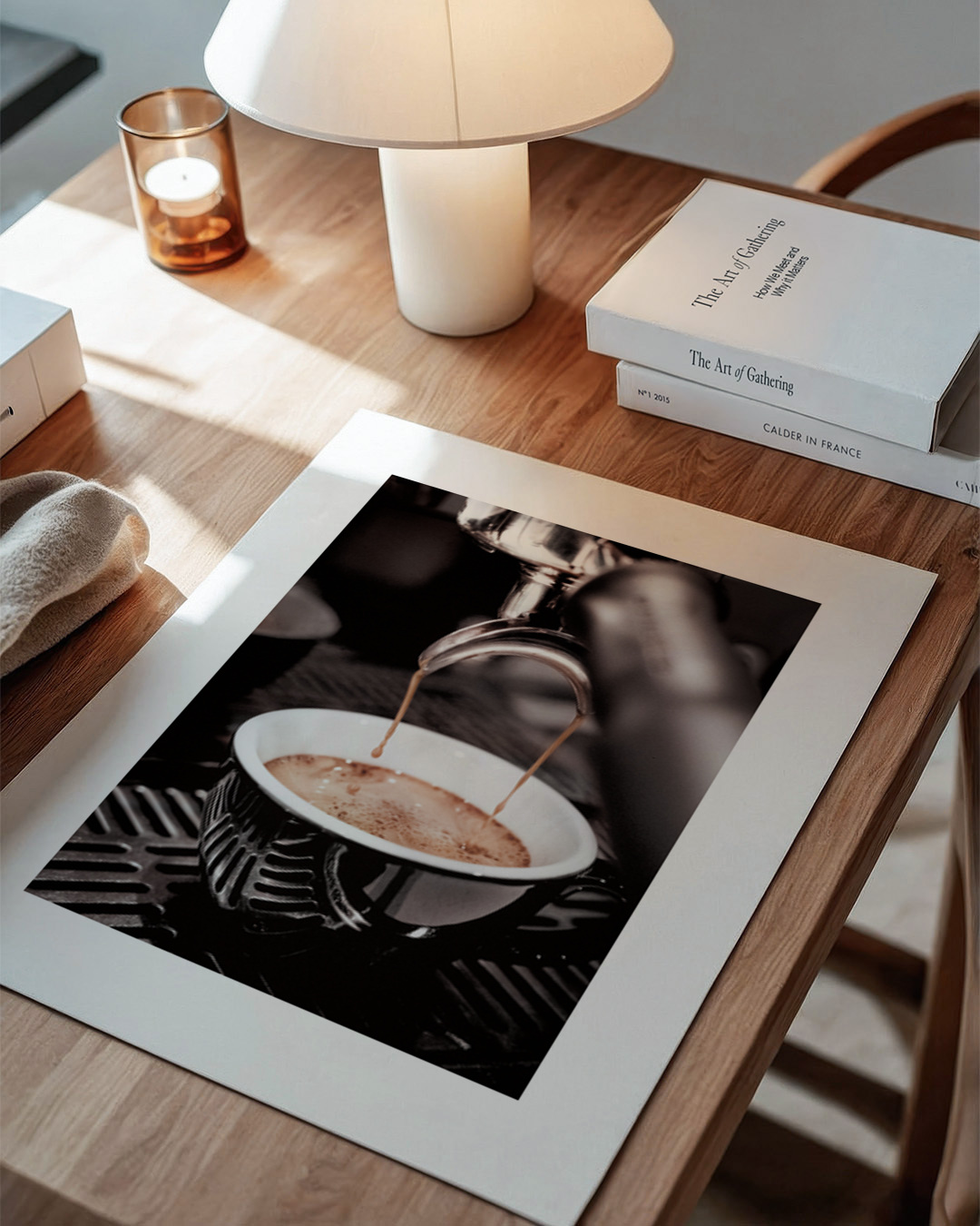A stunning photograph capturing the moment when espresso cascades perfectly into a white cup. The dark tones and high contrast create a captivating imagery for coffee lovers.