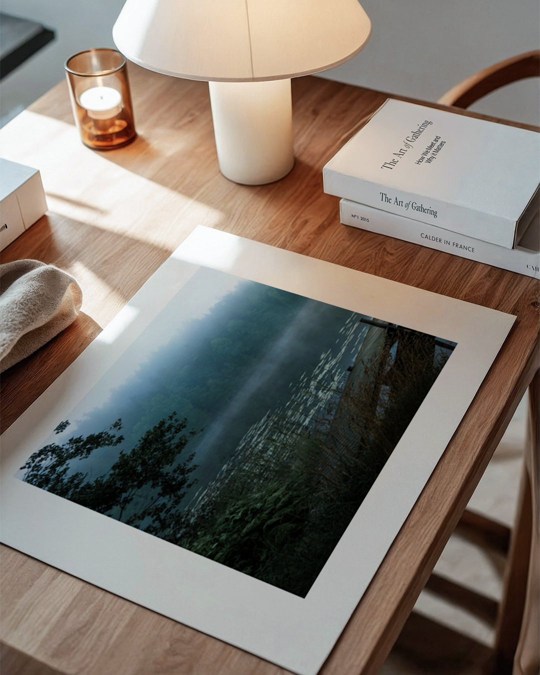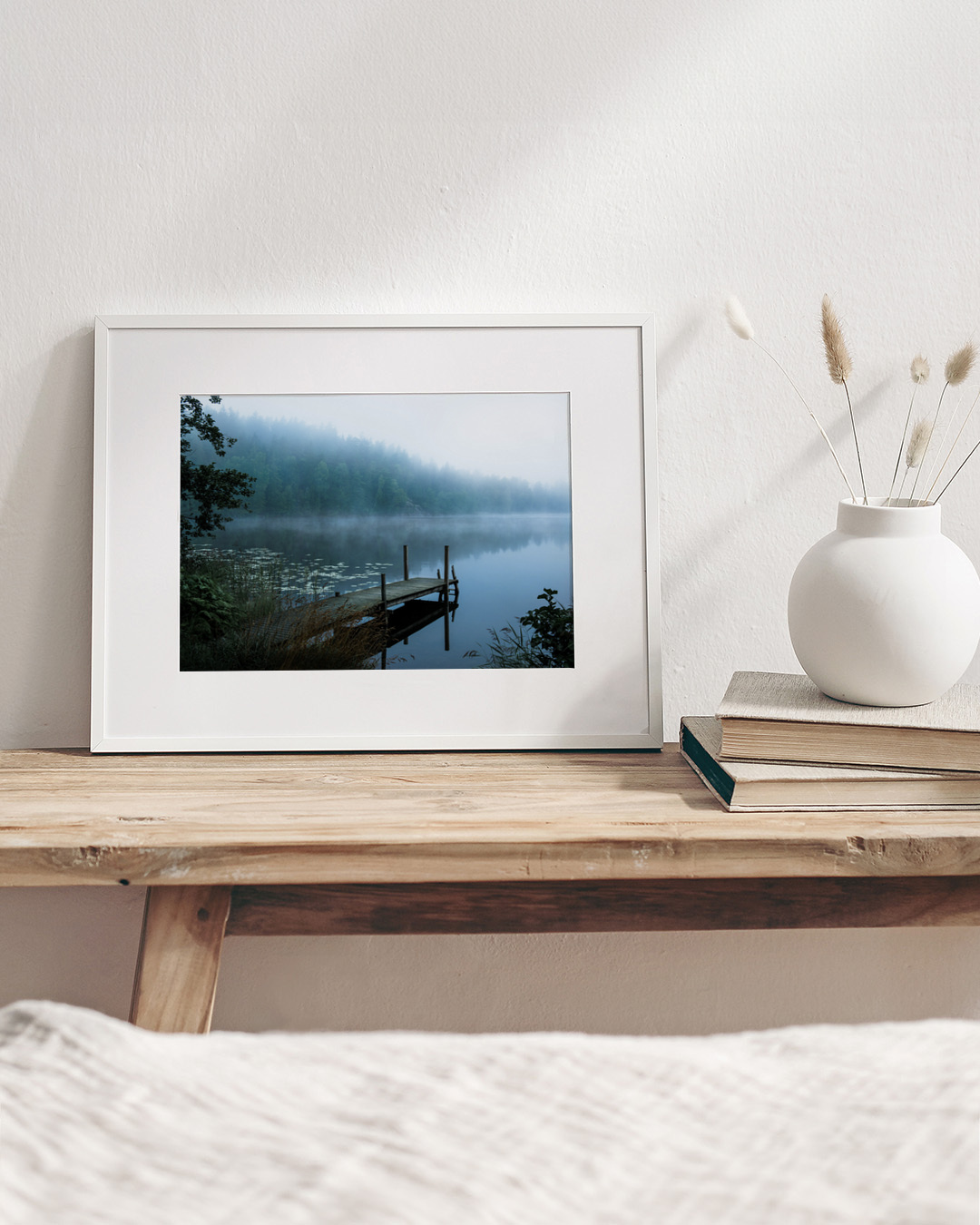 A captivating photo of a serene lake on a foggy morning, with trees in the background and a quiet wooden pier in the foreground.