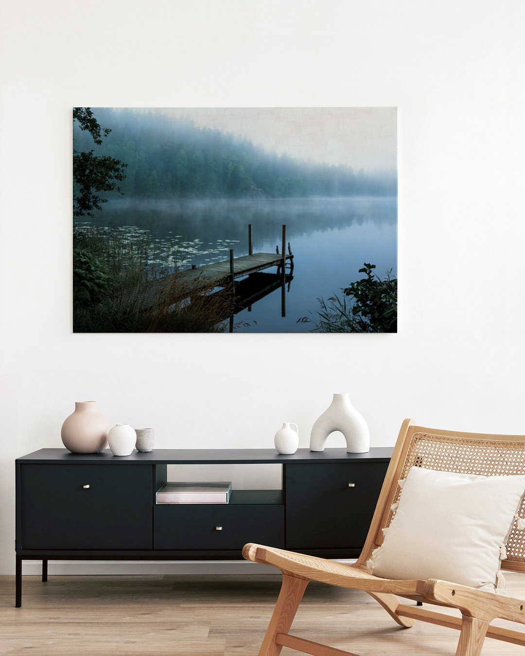 The stretched canvas is fitted with a sleek float frame in genuine wood for an elegant finish and extra dimension. The space between the canvas and the frame creates a floating effect.