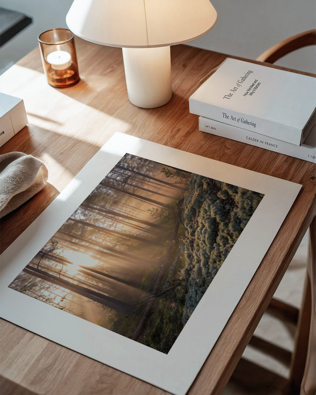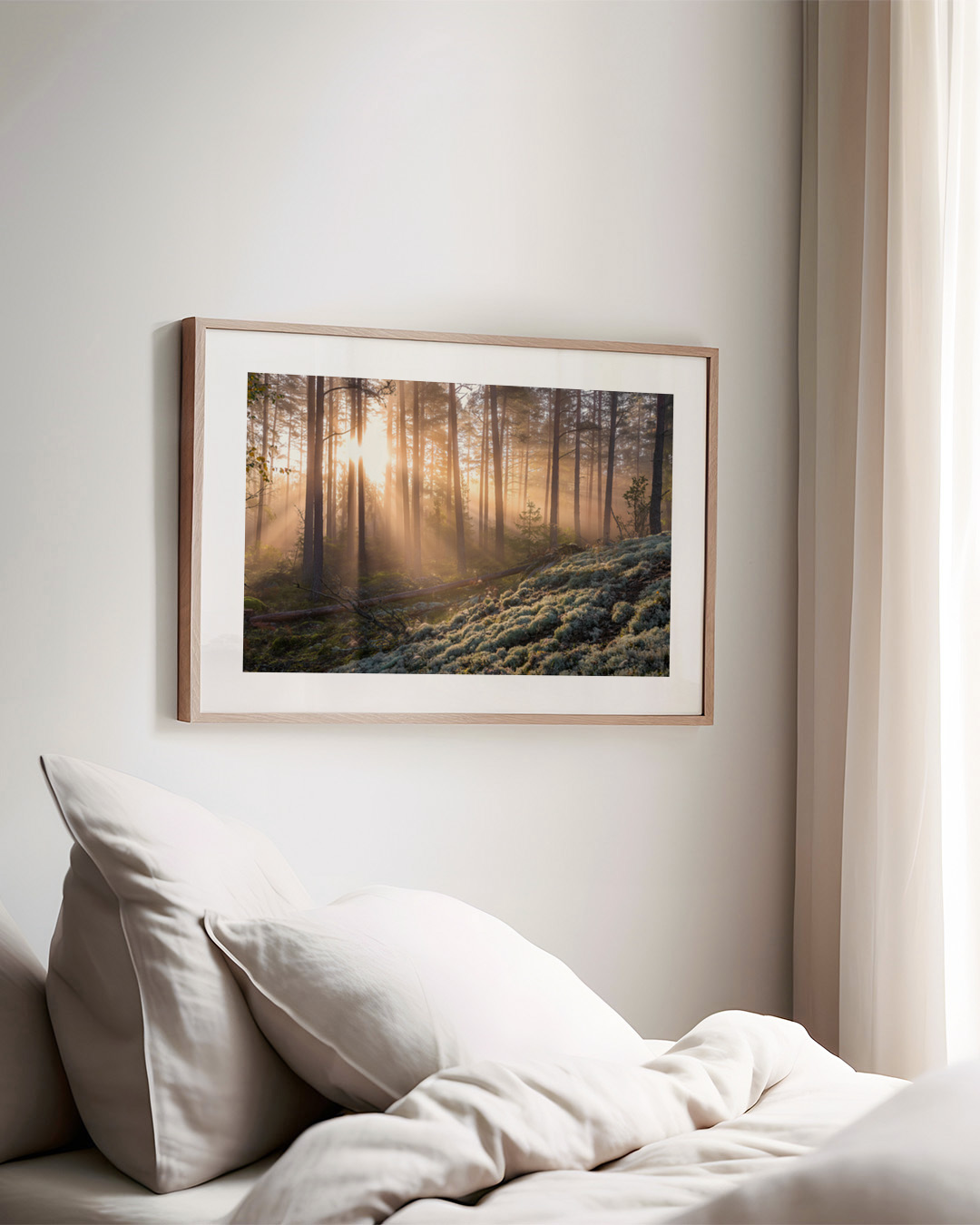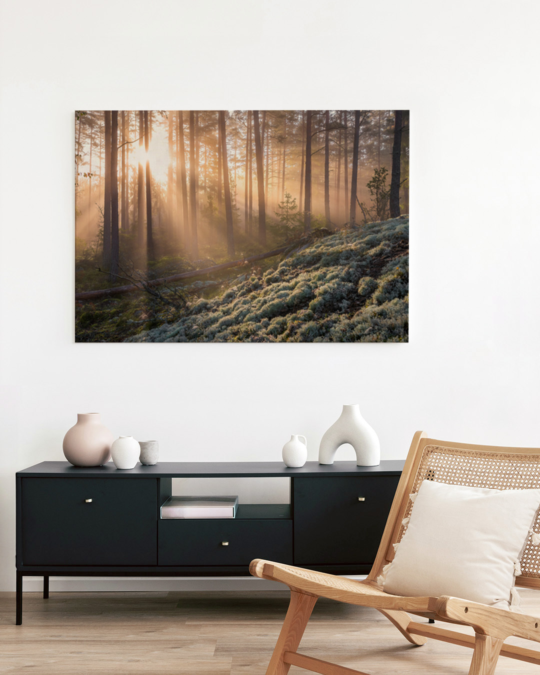 Immerse yourself in the serene beauty of a forest lit by golden sun rays filtering through the mist. This photographic print captures the tranquil atmosphere amidst nature's hues and soft mossy textures.