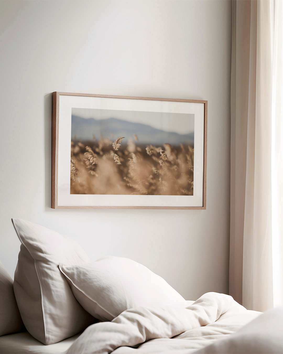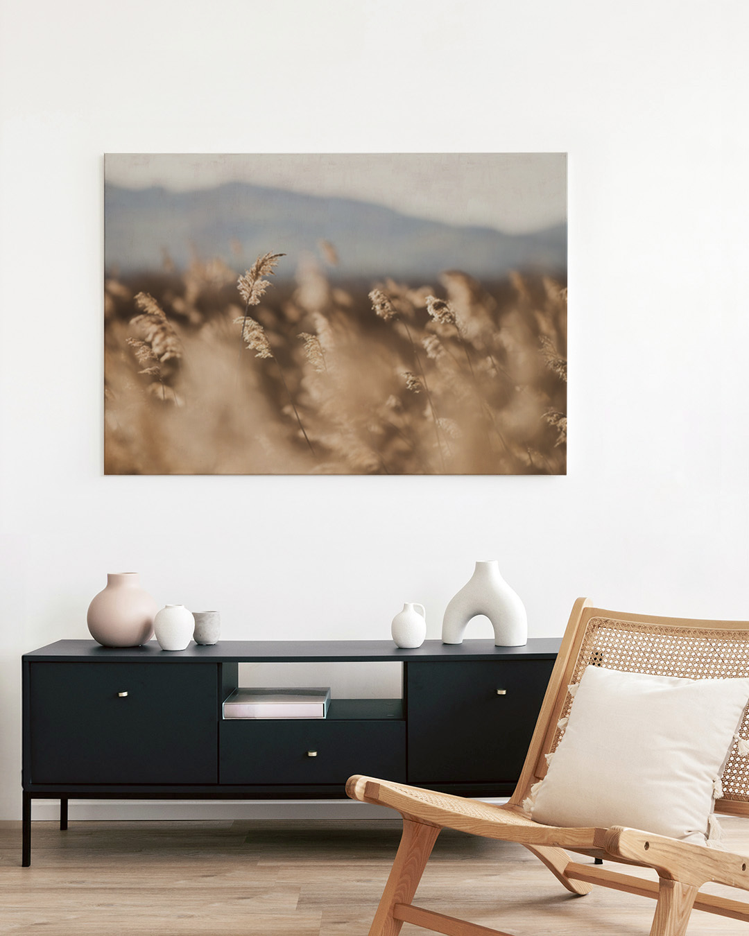 The stretched canvas is fitted with a sleek float frame in genuine wood for an elegant finish and extra dimension. The space between the canvas and the frame creates a floating effect.