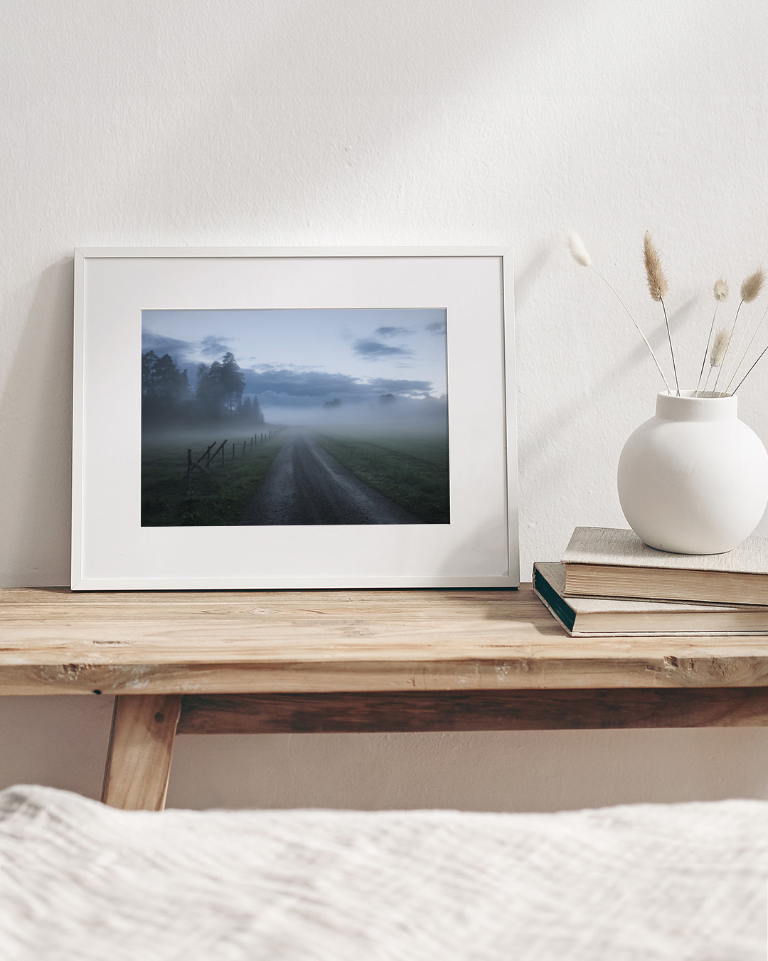 Capture the serene beauty of a foggy country road at dawn, where the morning light highlights the soft mist and tranquil surroundings, creating a peaceful atmosphere.