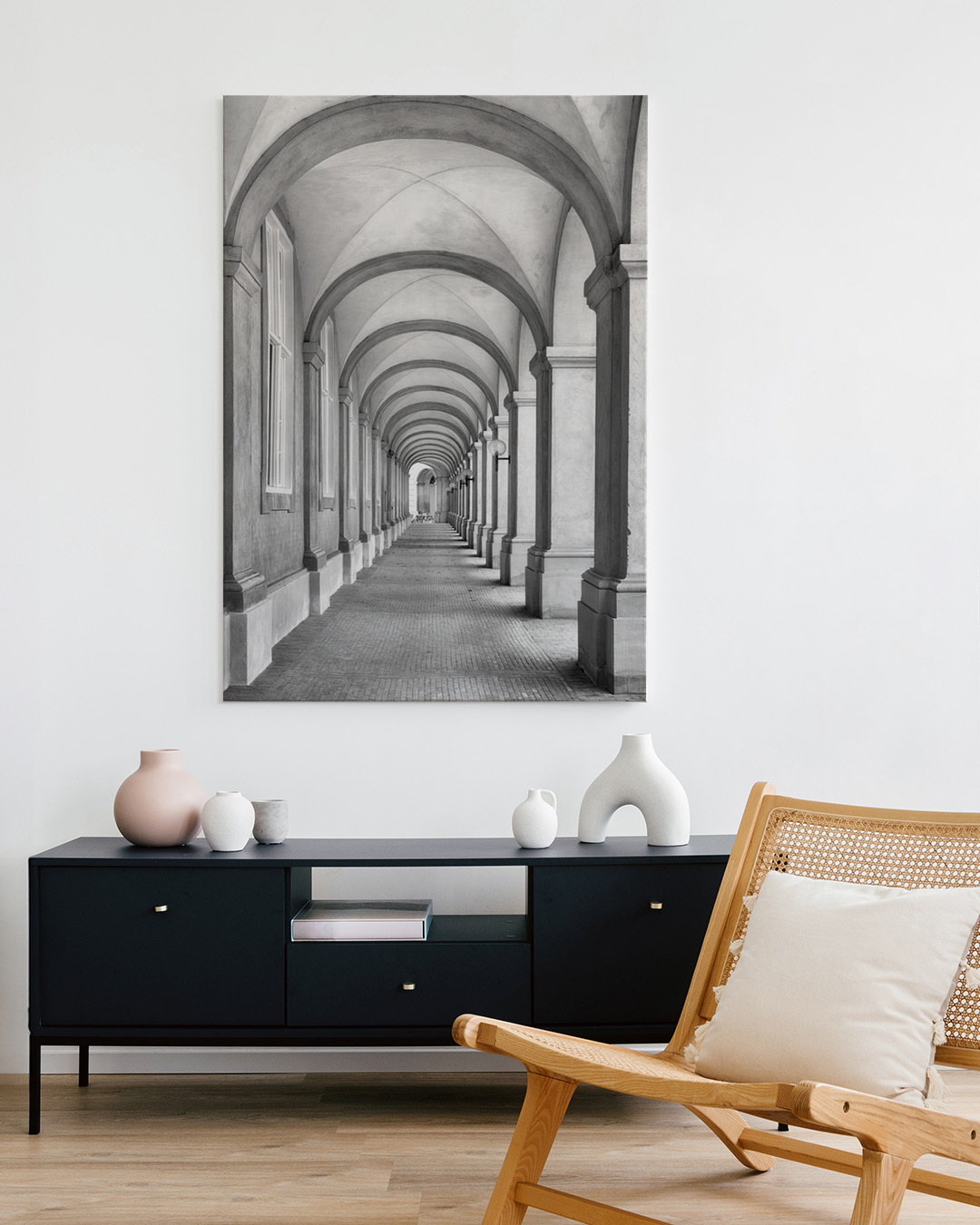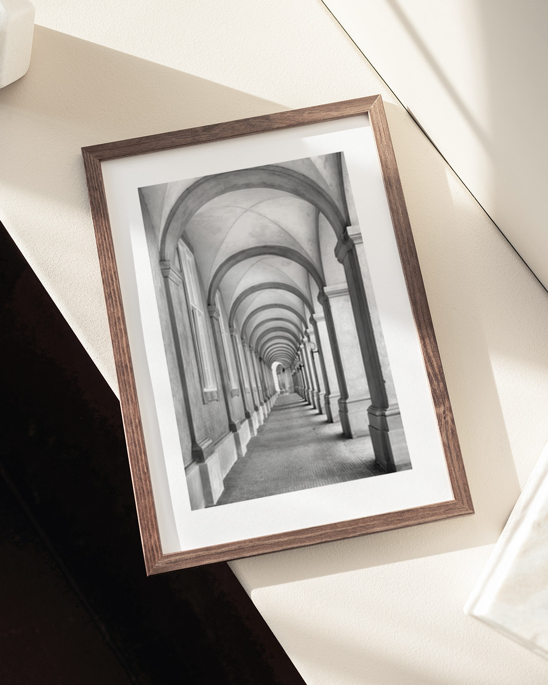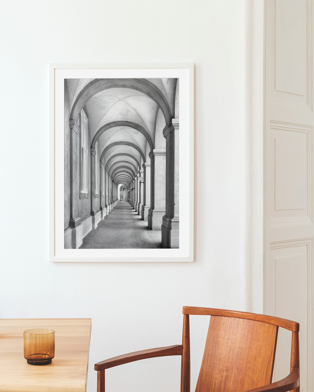 This black and white photograph showcases a timeless colonnade, inviting viewers to walk through its elegant archways. The use of monochrome emphasizes the architectural detail and endless perspective.