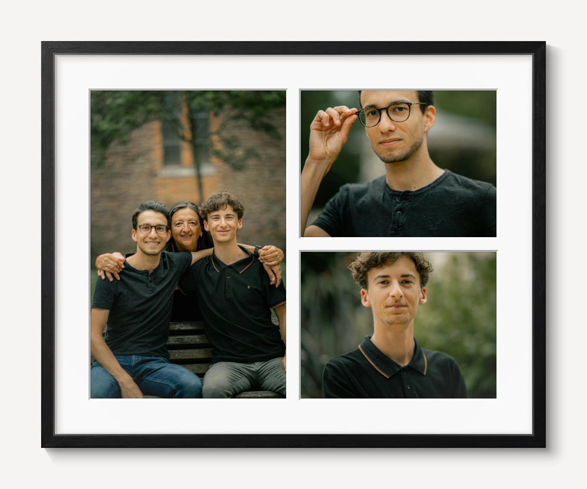 Collageram Balance levereras som standard med 3 foton,ramprofil Slim Svart, en vit passepartout på 1,7 mm, matt fotopapper (230 g) och 2 mm akrylglas.