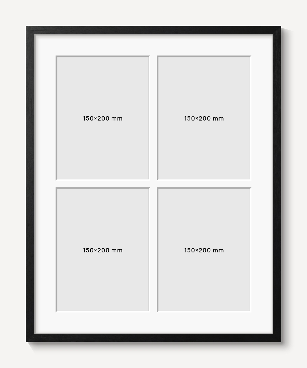 Collageram Quad levereras som standard med 4 foton,ramprofil Slim Svart, en vit passepartout på 1,7 mm, matt fotopapper (230 g) och 2 mm akrylglas.