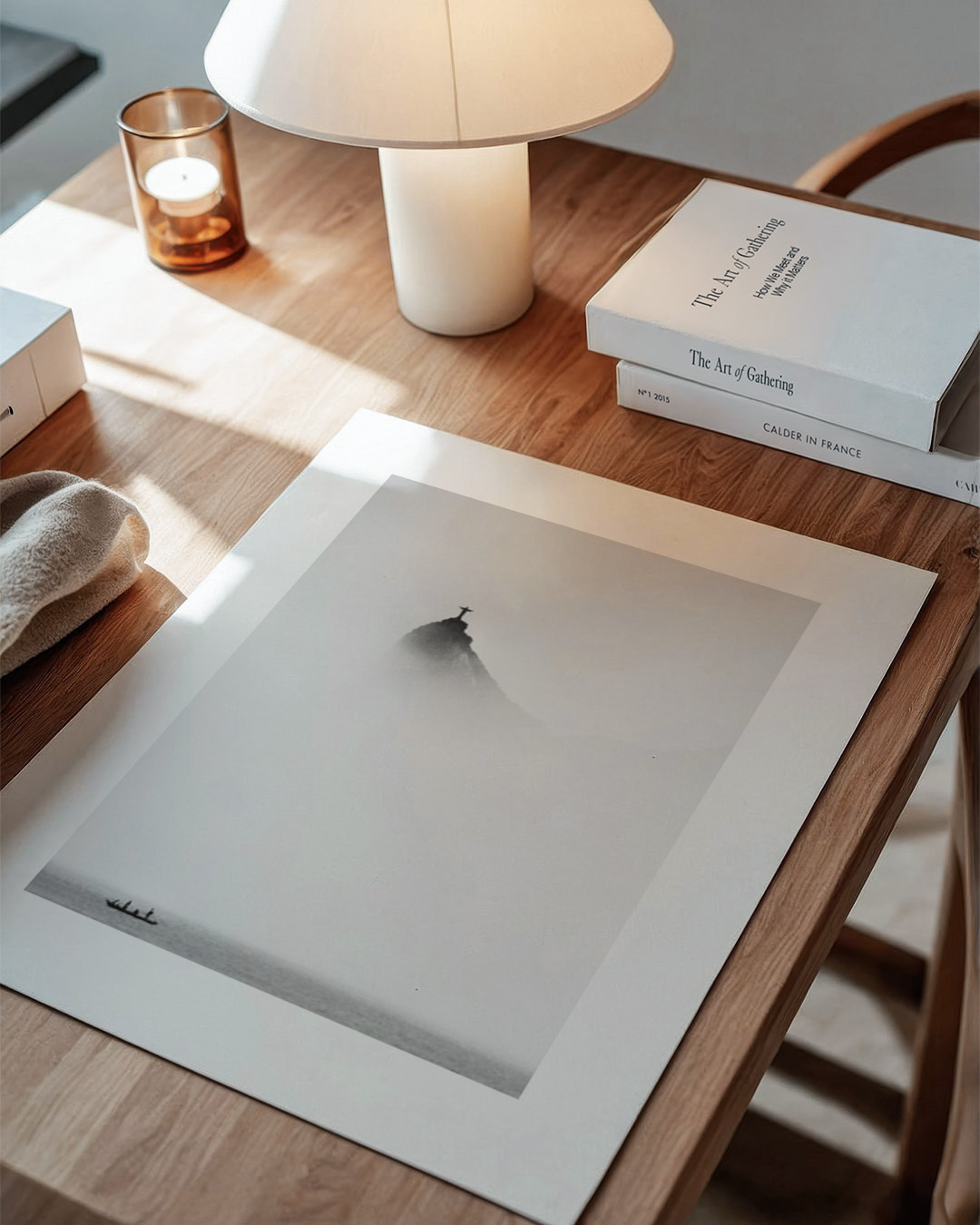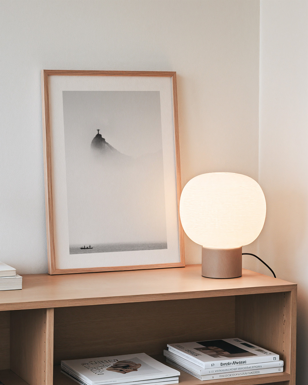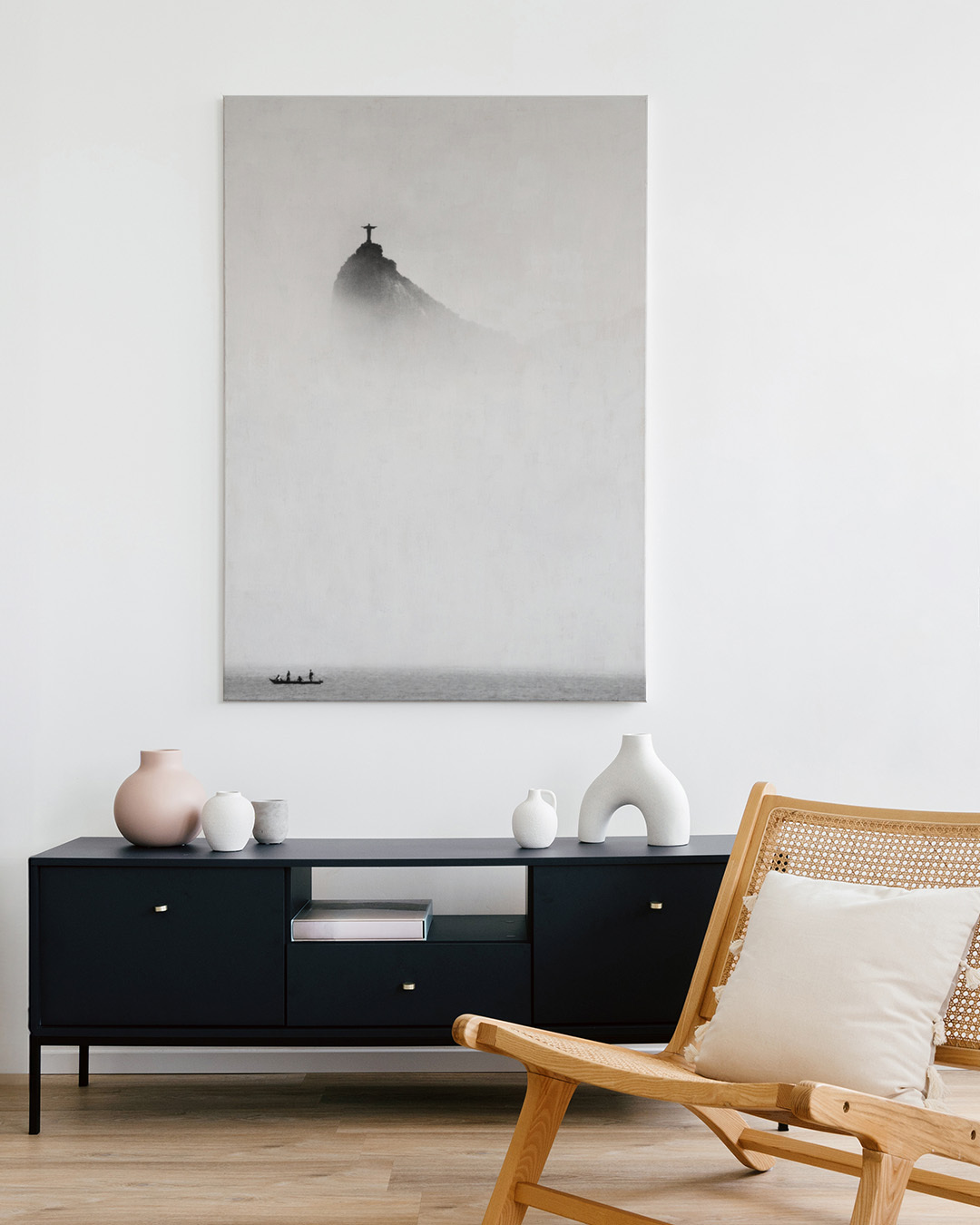 Den uppspända canvasen är inramad med en elegant skuggram i äkta trä för ett stilrent utseende och extra dimension. Utrymmet mellan canvasen och ramen skapar en svävande effekt.