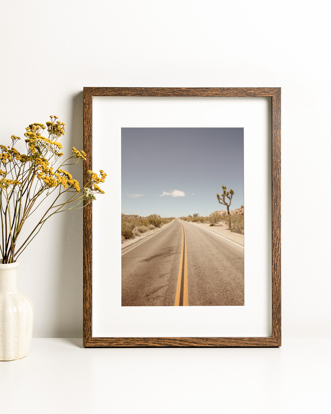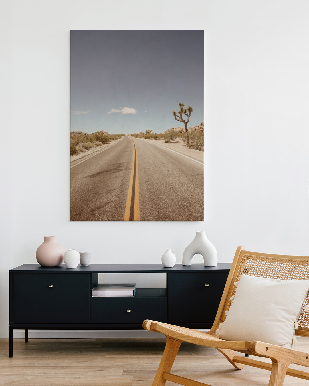 Den uppspända canvasen är inramad med en elegant skuggram i äkta trä för ett stilrent utseende och extra dimension. Utrymmet mellan canvasen och ramen skapar en svävande effekt.