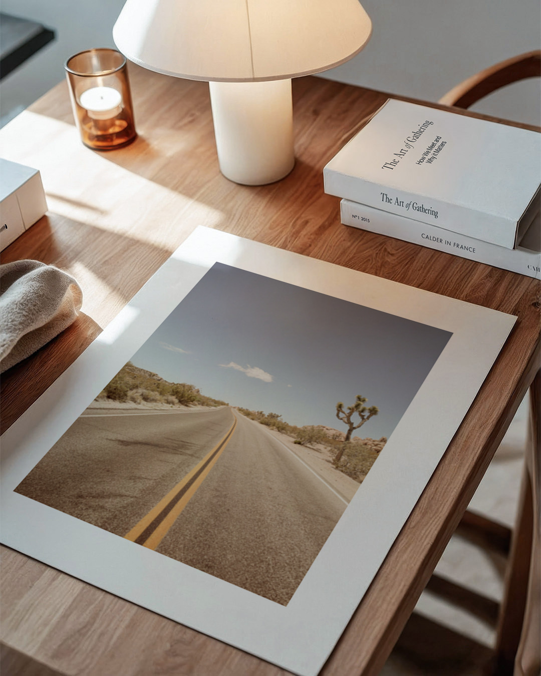 Upptäck ensamheten på en oändlig ökenväg som sträcker sig mot horisonten med en klar blå himmel ovanför. Perfekt för vandrare och drömmare, denna slående bild inbjuder till eftertanke och äventyr.