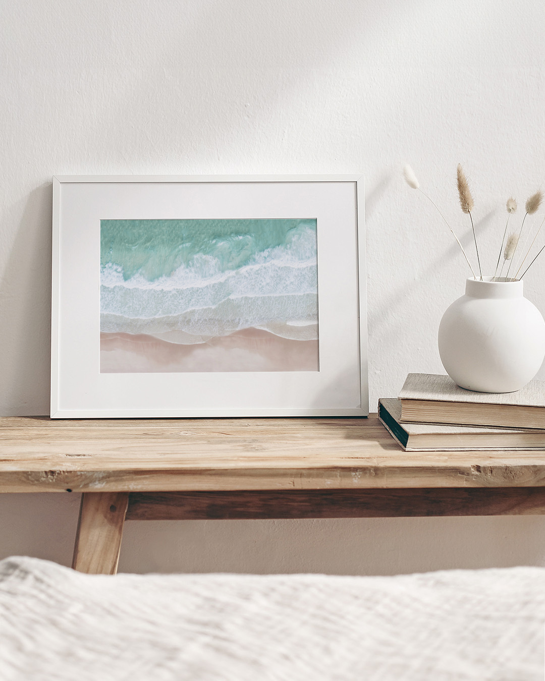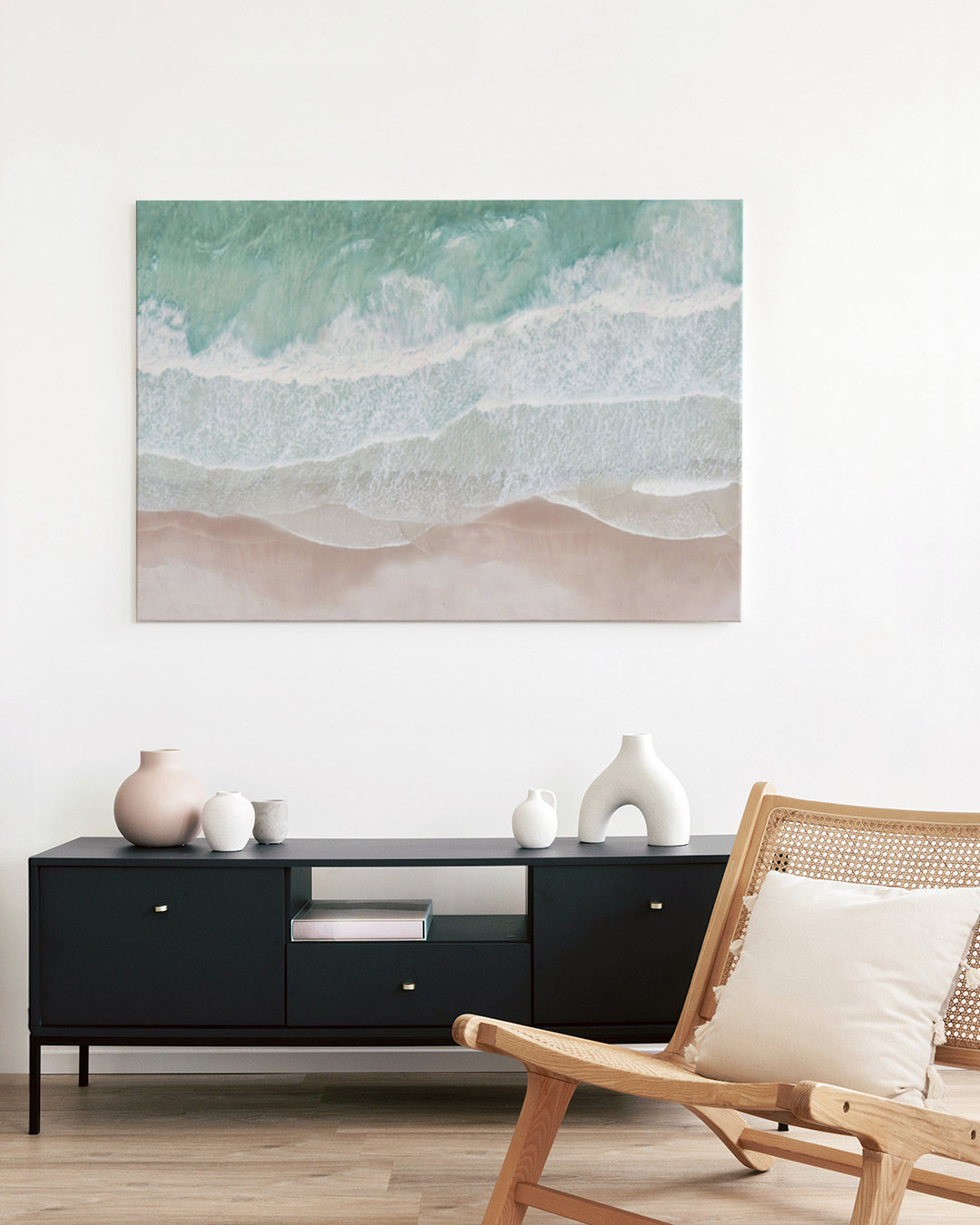 Den uppspända canvasen är inramad med en elegant skuggram i äkta trä för ett stilrent utseende och extra dimension. Utrymmet mellan canvasen och ramen skapar en svävande effekt.