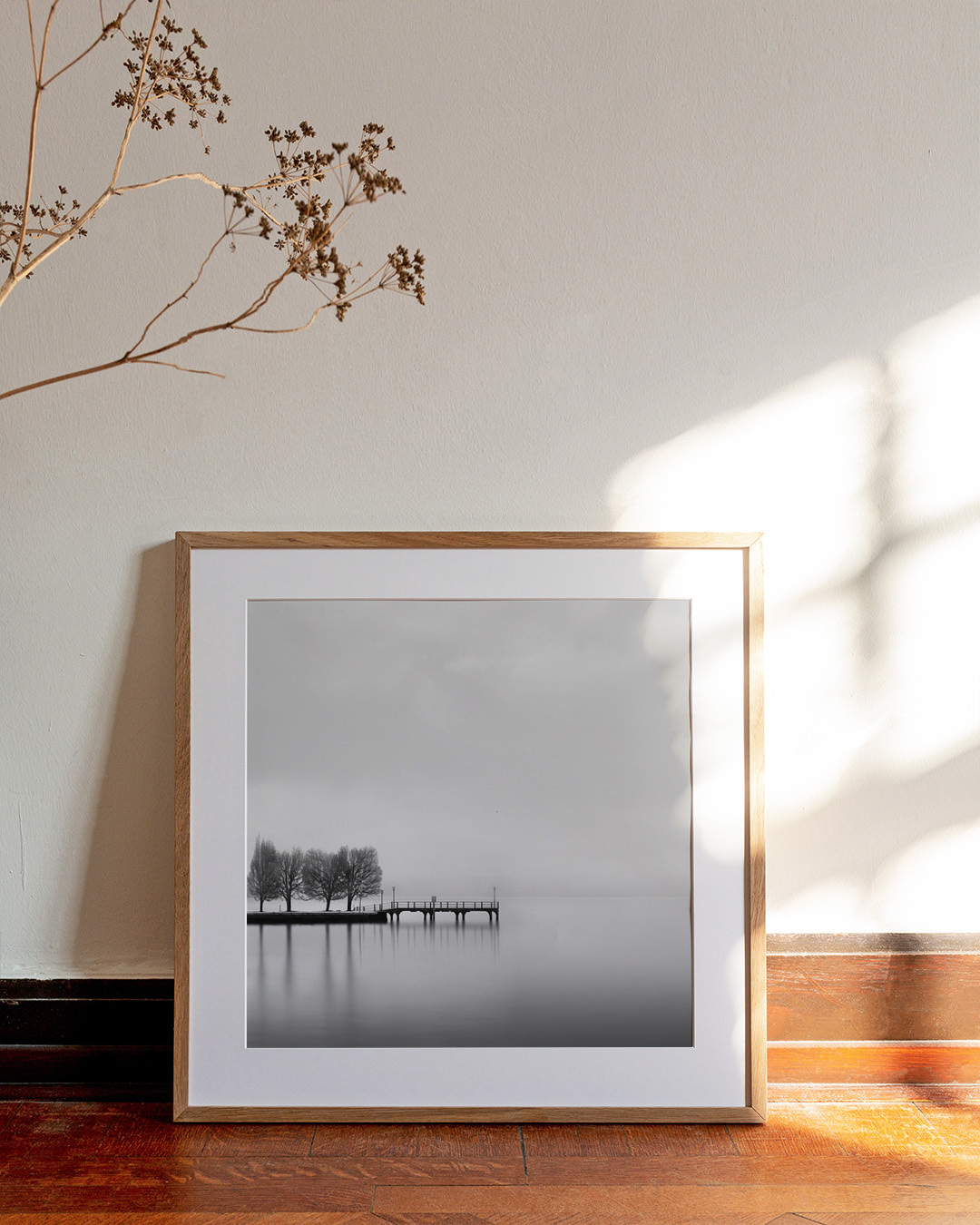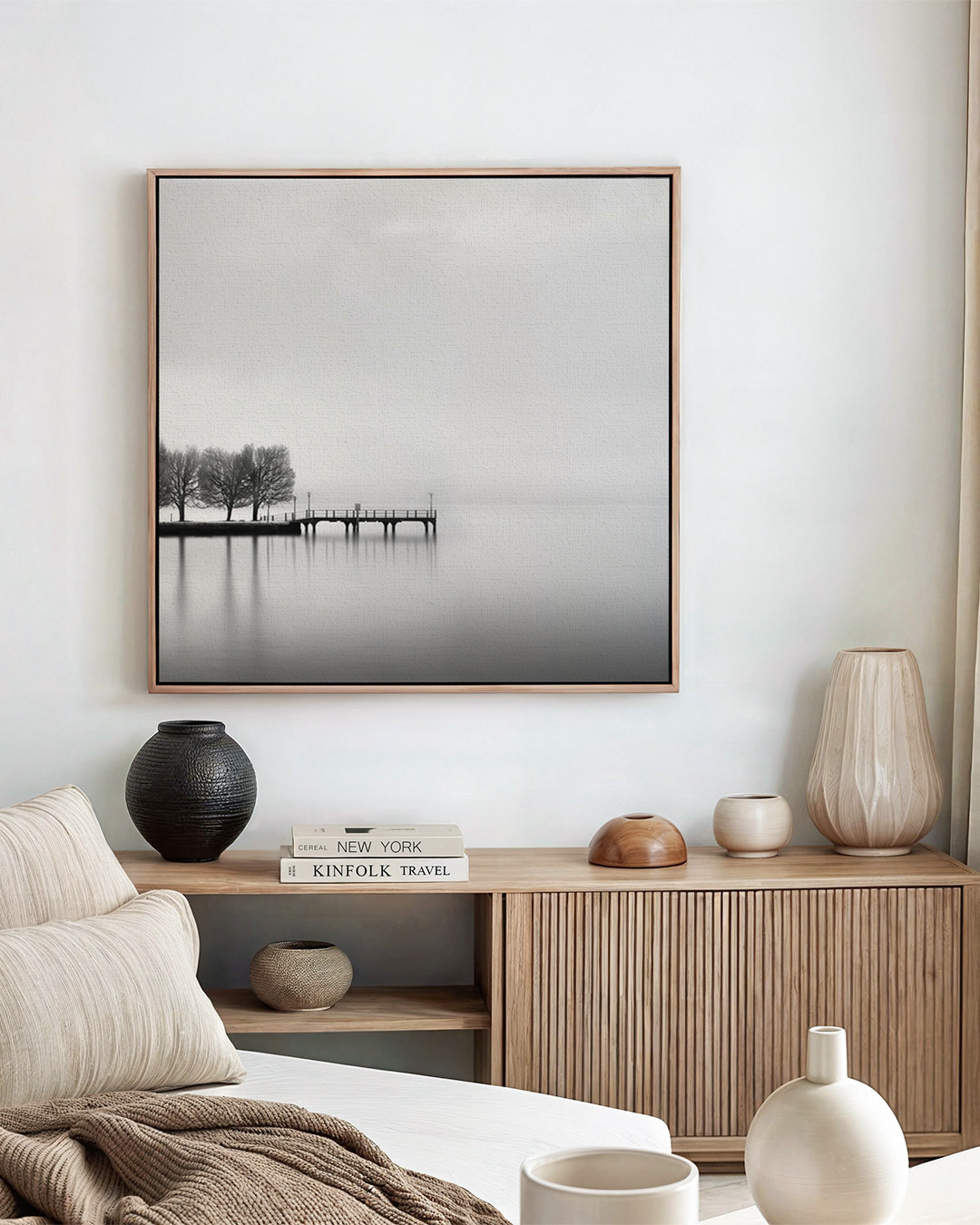Den uppspända canvasen är inramad med en elegant skuggram i äkta trä för ett stilrent utseende och extra dimension. Utrymmet mellan canvasen och ramen skapar en svävande effekt.
