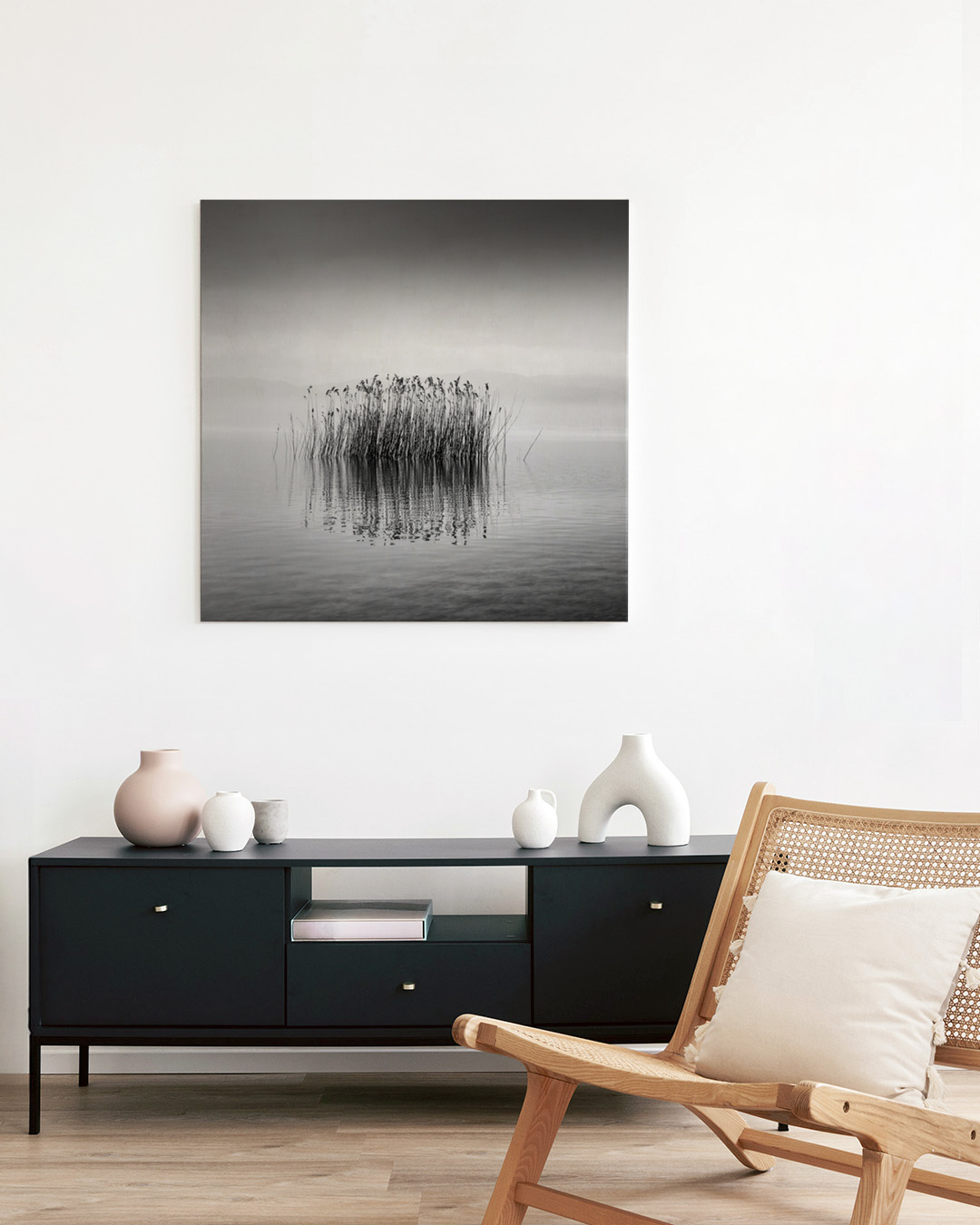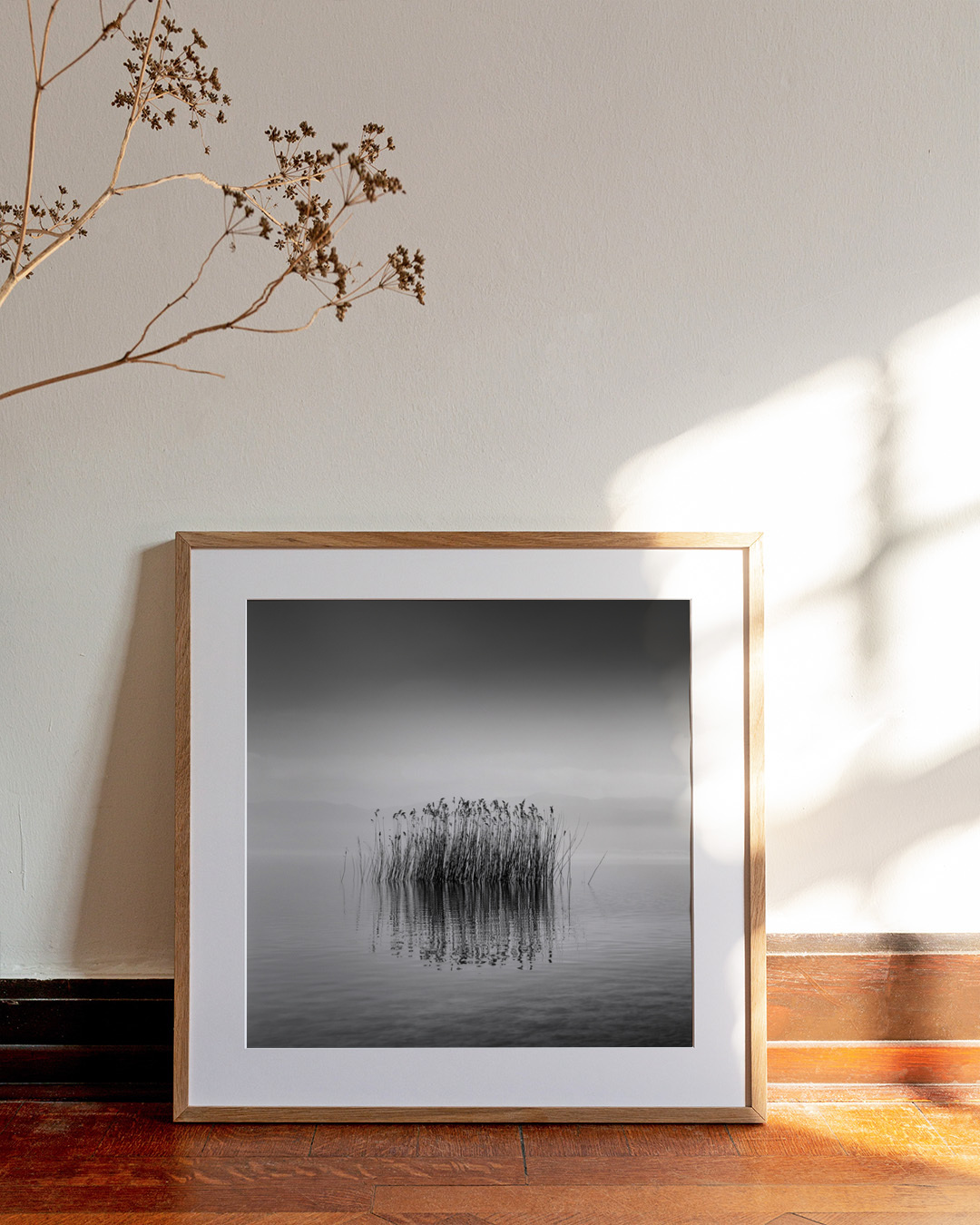 Den uppspända canvasen är inramad med en elegant skuggram i äkta trä för ett stilrent utseende och extra dimension. Utrymmet mellan canvasen och ramen skapar en svävande effekt.