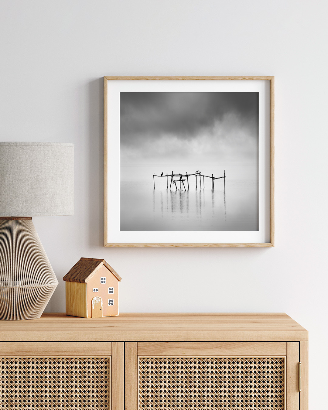 Detta stillsamma svartvita fotografi av George Digalakis fångar lugnet i ett minimalistiskt vattenlandskap med en gammal träkonstruktion, som smälter samman med den dimmiga himlen och subtila reflektioner.