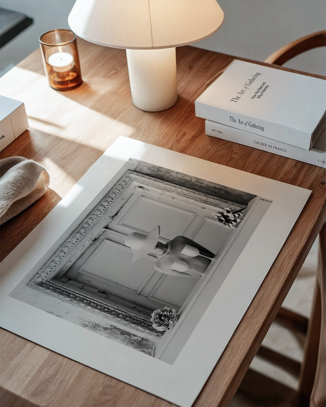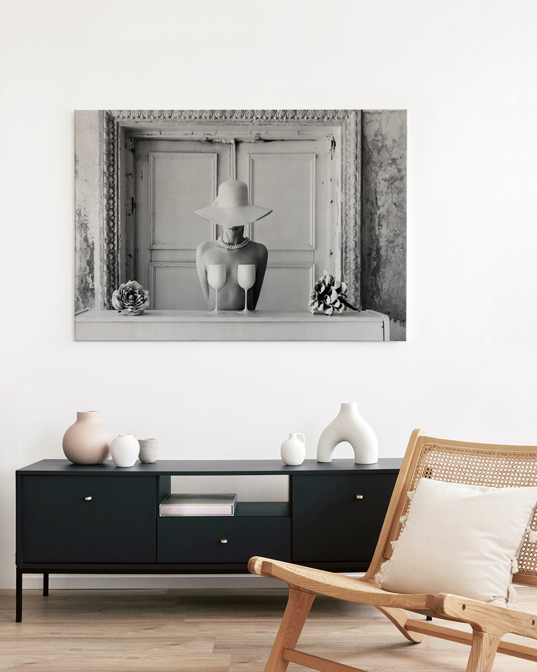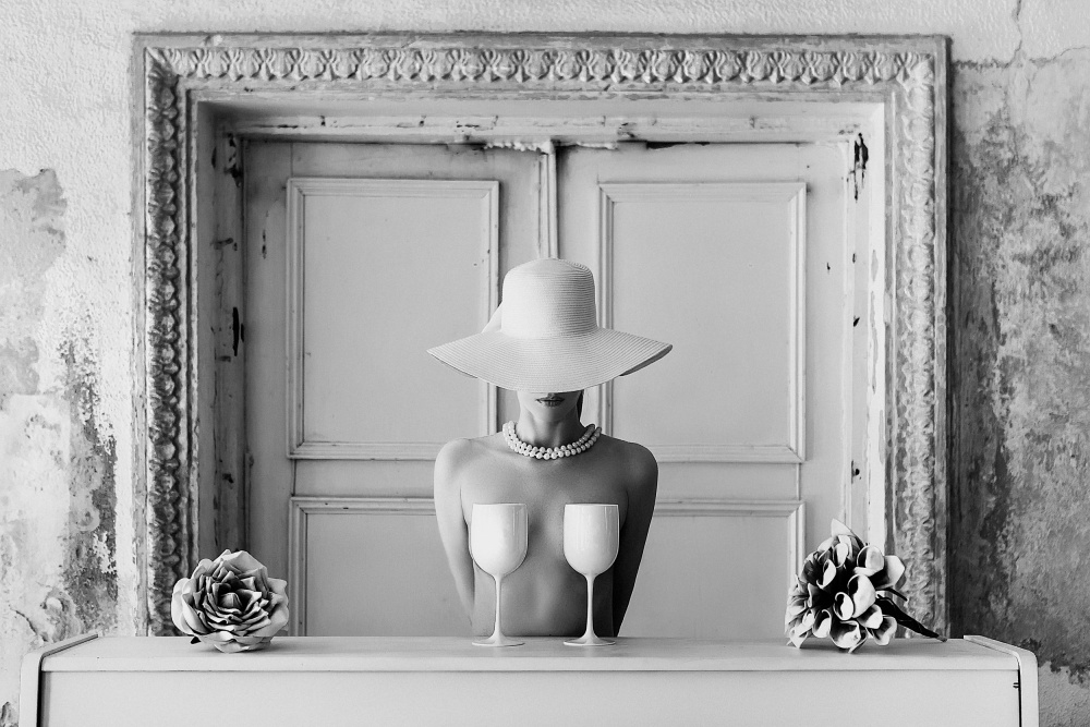 Detta fängslande svartvita fotografi visar en elegant kvinna med vidbrättad hatt och pärlor, poserandes bakom två vinglas, vilket ger en känsla av sofistikerad mystik.