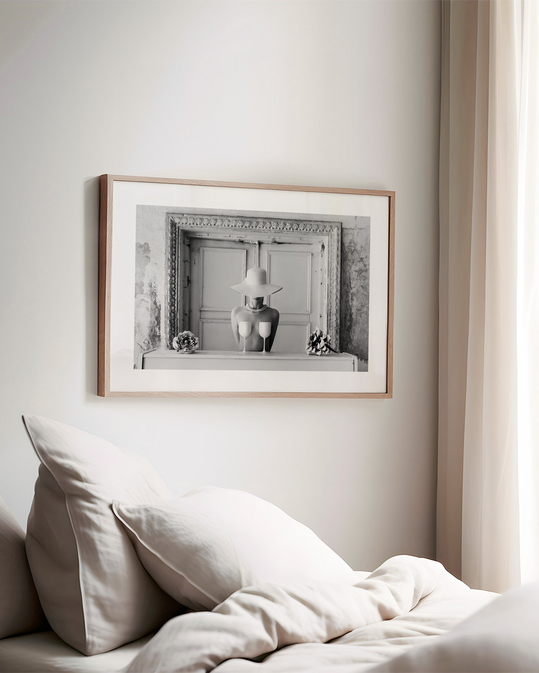 Den uppspända canvasen är inramad med en elegant skuggram i äkta trä för ett stilrent utseende och extra dimension. Utrymmet mellan canvasen och ramen skapar en svävande effekt.