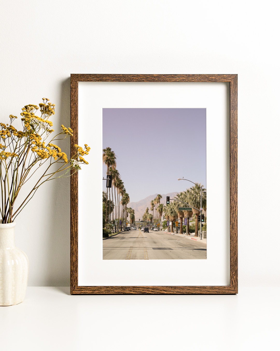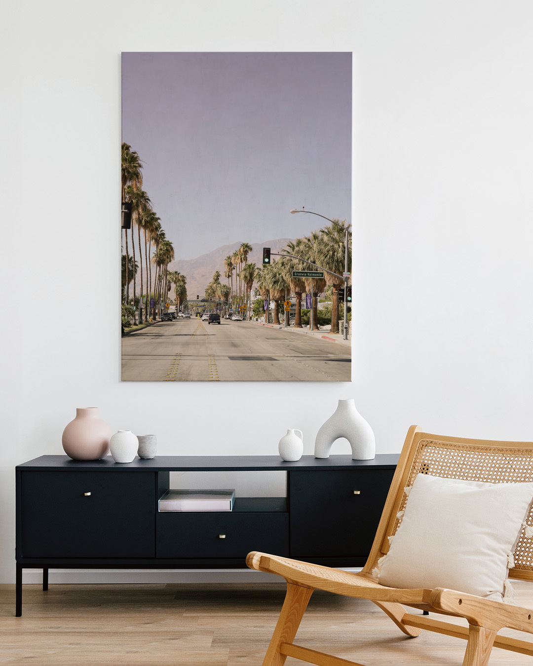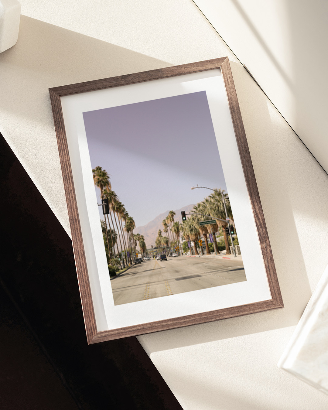 Fånga den fridfulla skönheten av en palmfodrad aveny under en klar himmel. Detta resfotografi tar dig till en lugn gata i Palm Springs.
